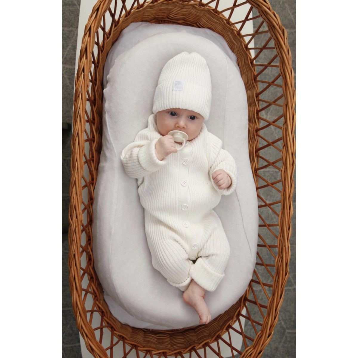 Комбинезон вязаный, отлино тянется и садится идеально по фигуре малыша, не сковывая движения. Подойдет с рождения до полугода. В начале можно подвернуть манжеты. Комбинезон очень мягкий и нежный.