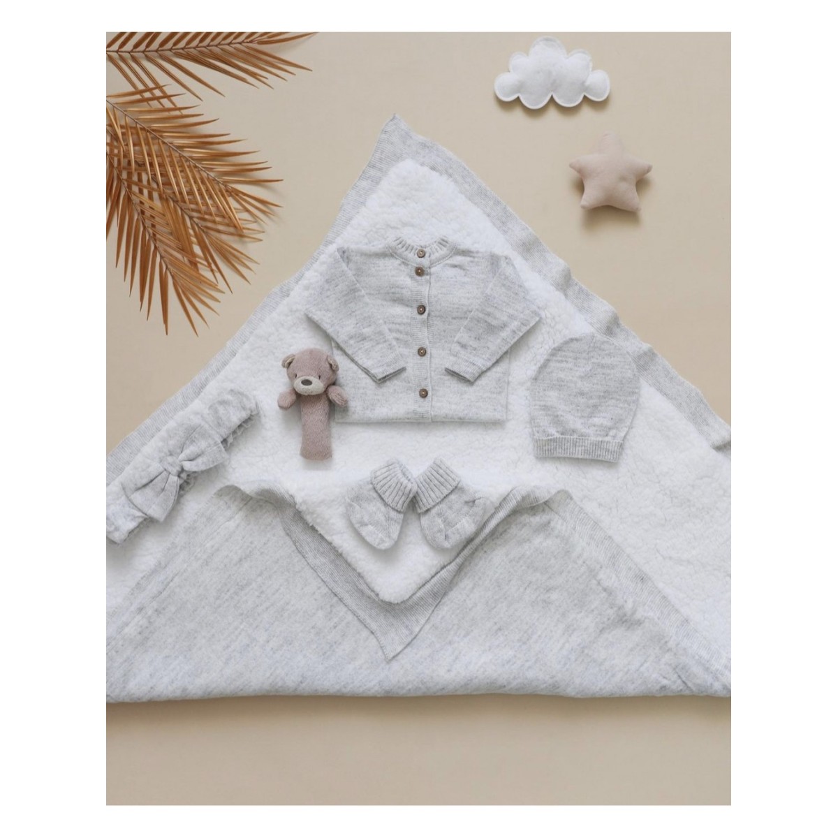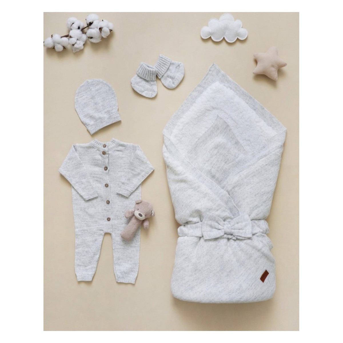 Мягкий практичный комплект на выписку из вязанного полотна (шерсть 50%, ПАН 50%) . Плед одеяло на мягкой подкладке из меховушки, утеплен альполюксом. На выписке будет стильным украшением, а в дальнейшем будет согревать кроху на прогулке.