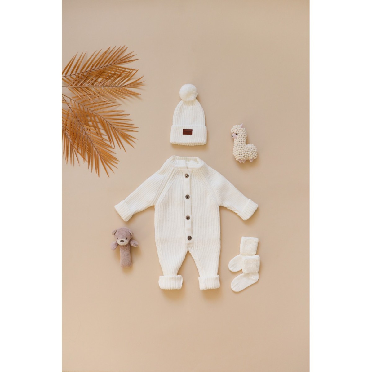 Детский вязаный набор: комбинезон +шапочка+носочки 56-68 см цвет: молочный В059