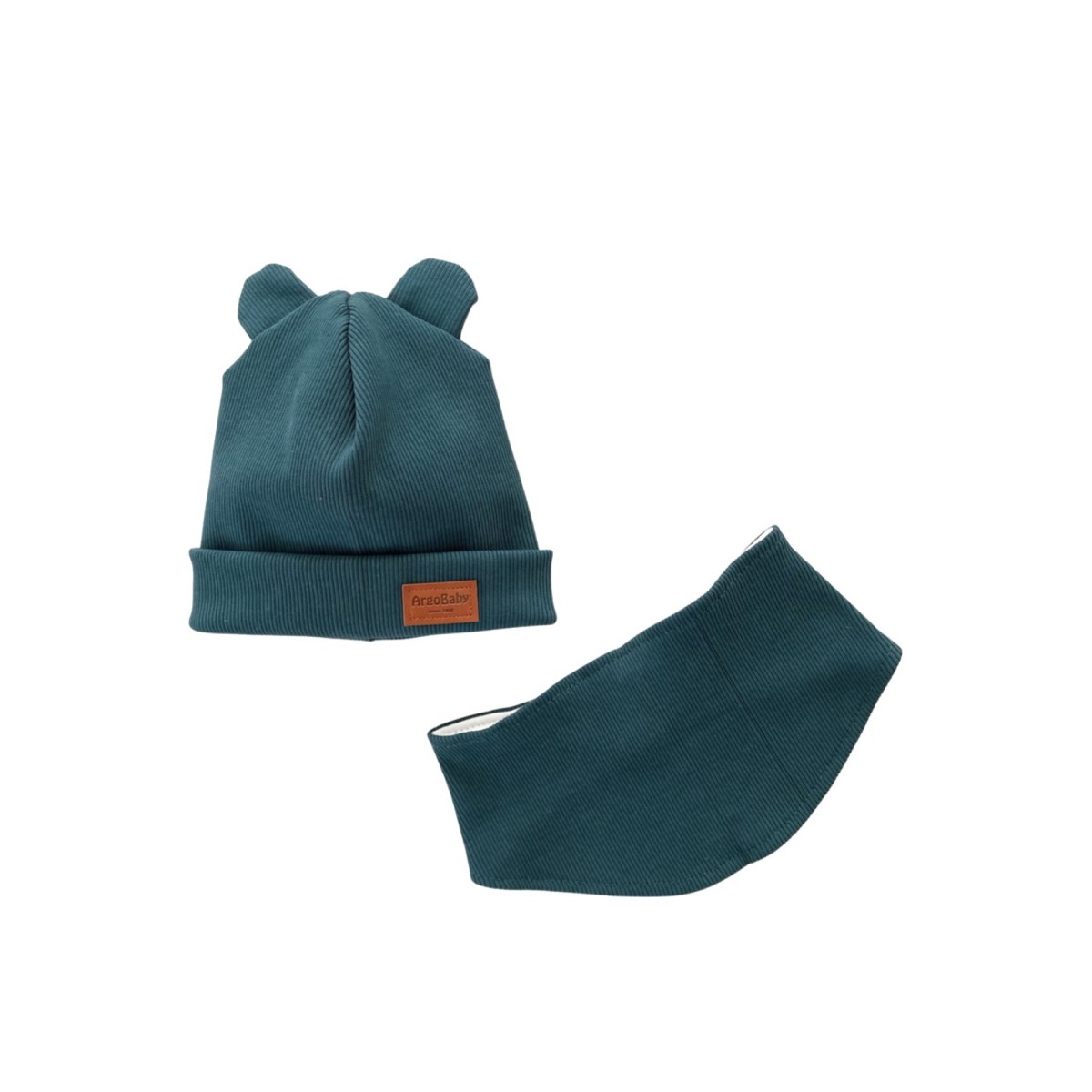 Двойная шапочка выполнена из кашкорсе , 95% хлопок и 5% эластан. Хорошо тянется и за счёт отворотов регулируется по размеру.