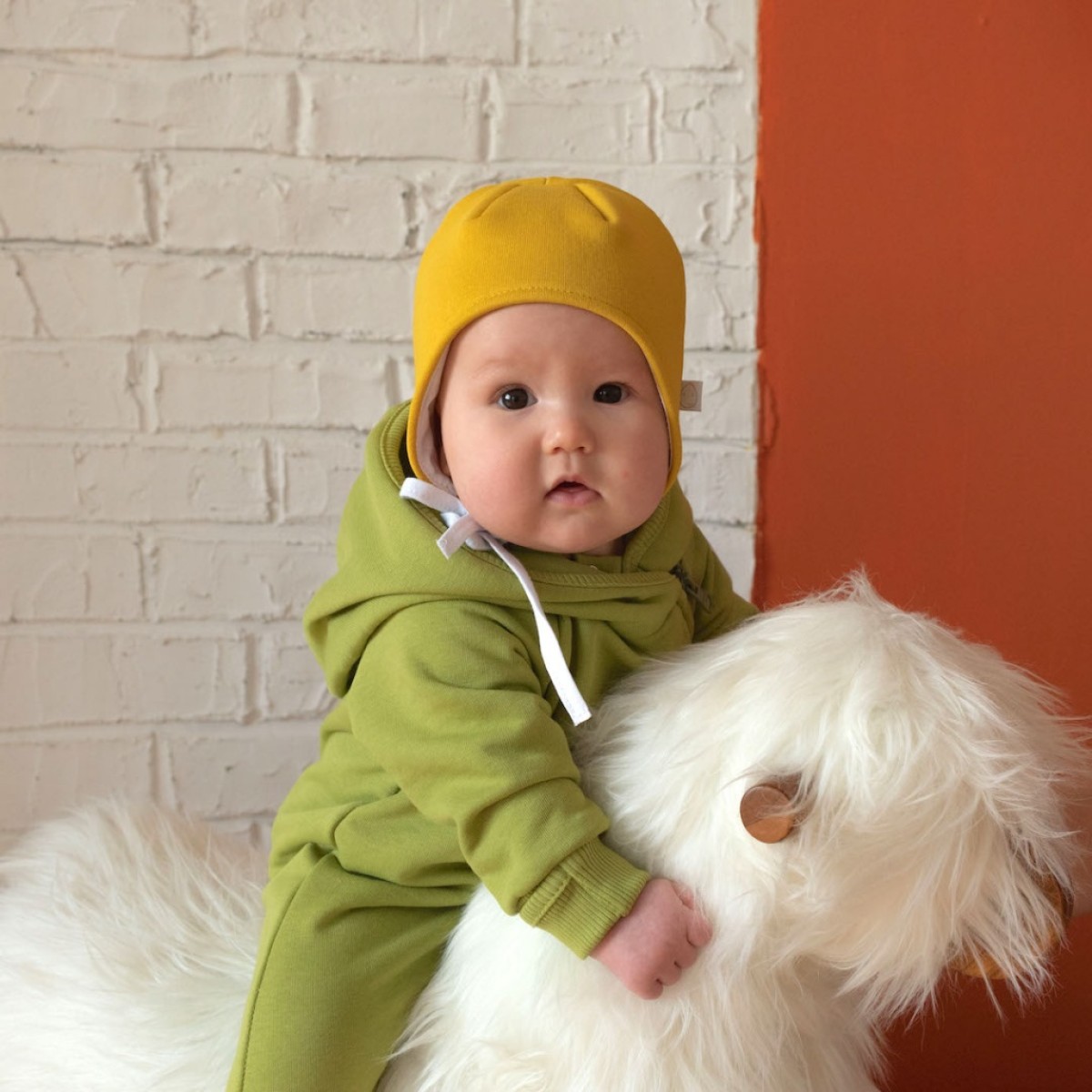 Классическая шапочка на завязках. Рекомендуется подбирать точно по размеру головы ребенка, поскольку ткань не очень эластична.