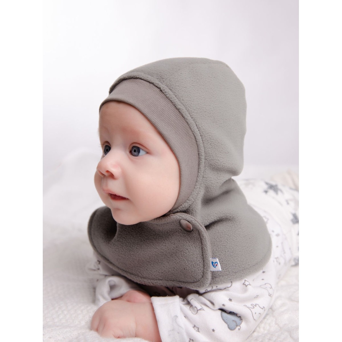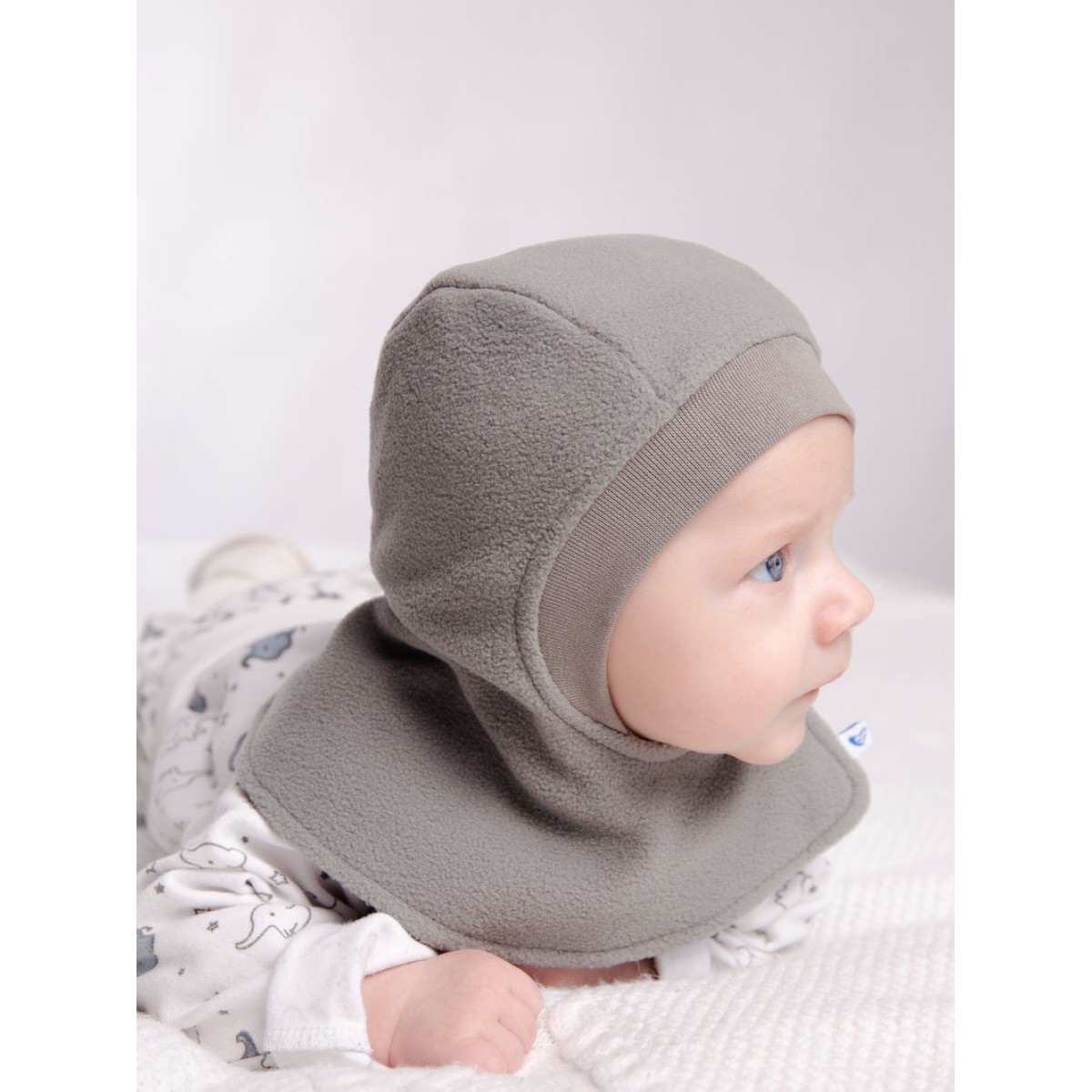 Двойная шапочка с расстегивающейся манишкой. Верхний слой выкроен из флиса, нижний слой - из трикотажного хлопкового полотна.