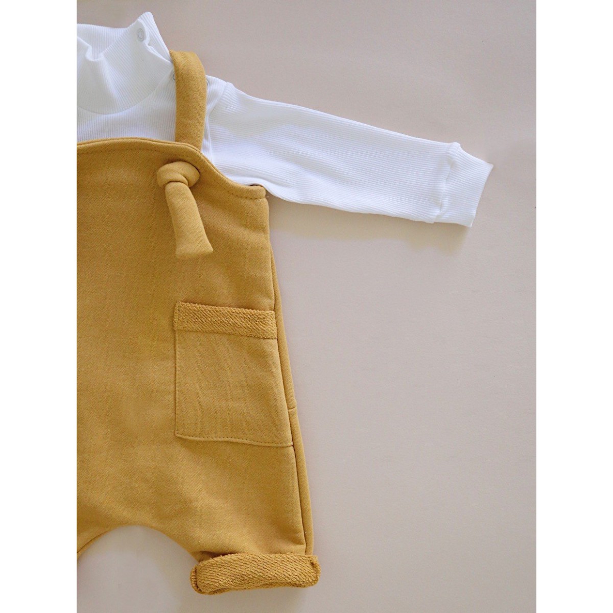 Лямочки регулируются по длине и фиксируются на узелочки. Подворотики на штанишках и кармашки для самых нужных мелочей.