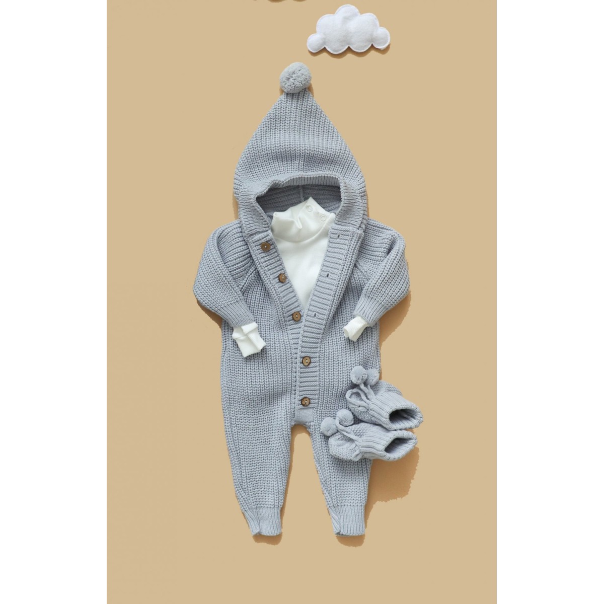 Стильный вязаный комбинезон для малыша с капюшоном.