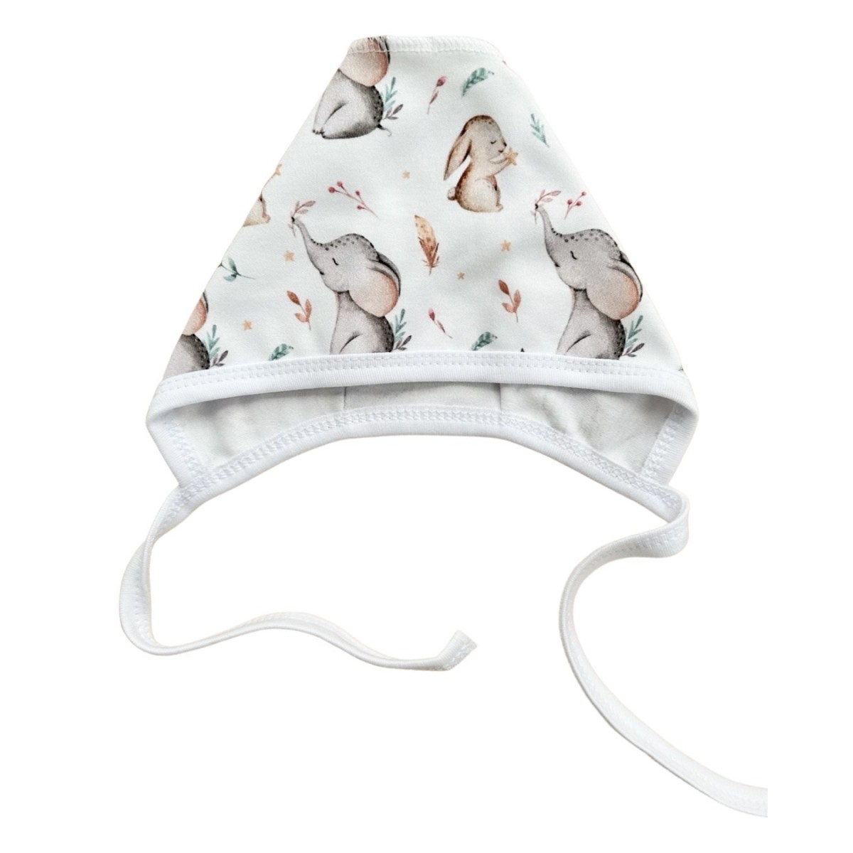 Чепчик с завязками и швами наружу 0-3 месяца принт: слоники и зайчики Т-130