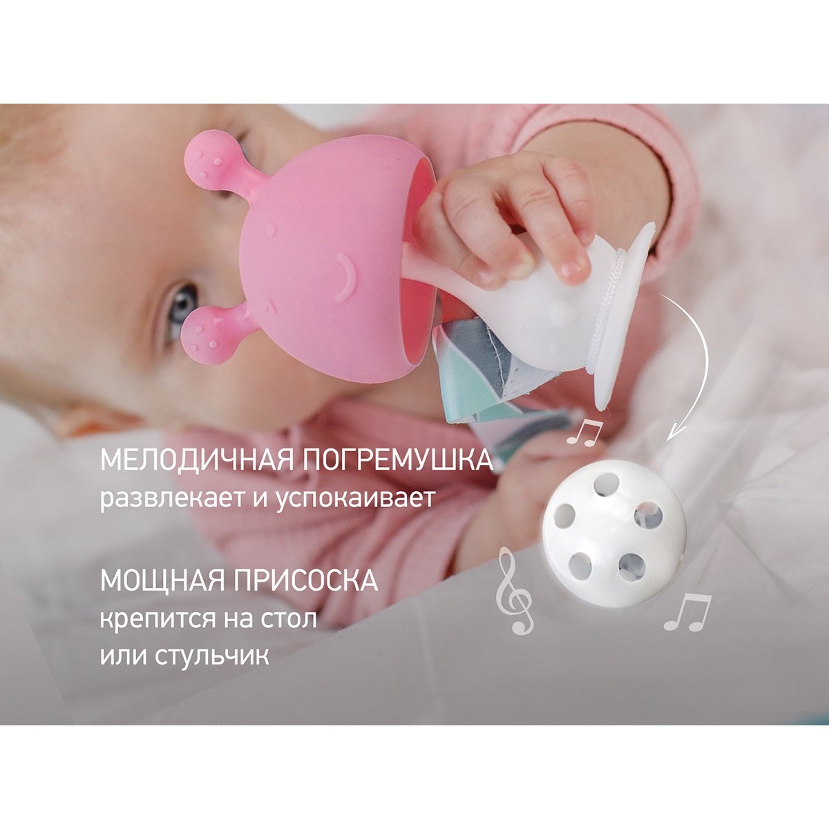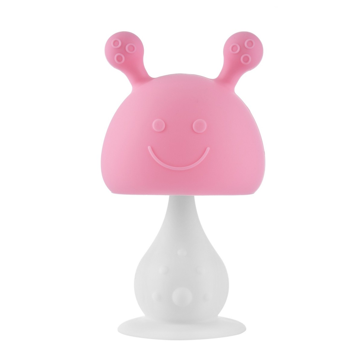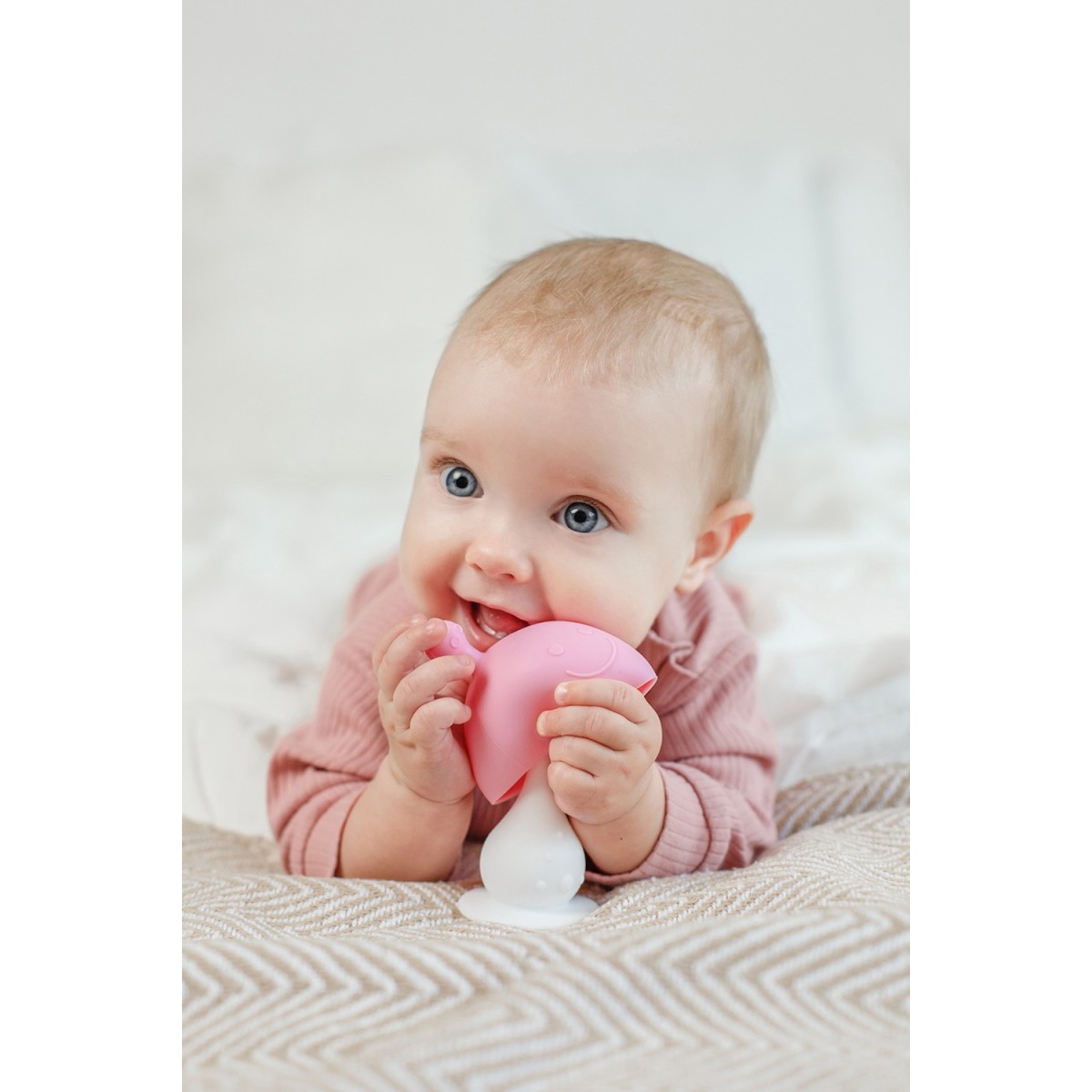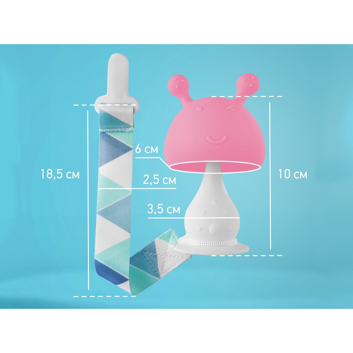Прорезыватель для зубов MUSHROOM в форме грибочка безопасно массирует десны двумя ушками разной степени жесткости и снимает неприятные ощущения во время прорезывания зубов. Элементы в форме соска напоминают малышу мамину грудь. Кулачок малыша полностью помещается внутри полусферы грибочка. Ребенок крепко держит прорезыватель в кулачке и отучается от сосания пальца. Благодаря анатомической форме прорезыватель подходит для новорожденных и может выполнять функцию соски. Использование прорезывателя успокаивает малыша, развивает координацию и моторику рук, мелодичная погремушка внутри привлекает внимание и развлекает ребенка. С помощью присоски прорезыватель можно установить на столик или детский стульчик. В комплект входит держатель с надежной запатентованной клипсой, поэтому прорезыватель не упадет и не потеряется. Один конец держателя прикрепляется к прорезывателю, а второй при помощи специальной клипсы пристегивается к одежде ребенка. Держатель выполнен из двух слоев полиэстера, прочно сшитых вместе, поэтому он не износится и не порвется.