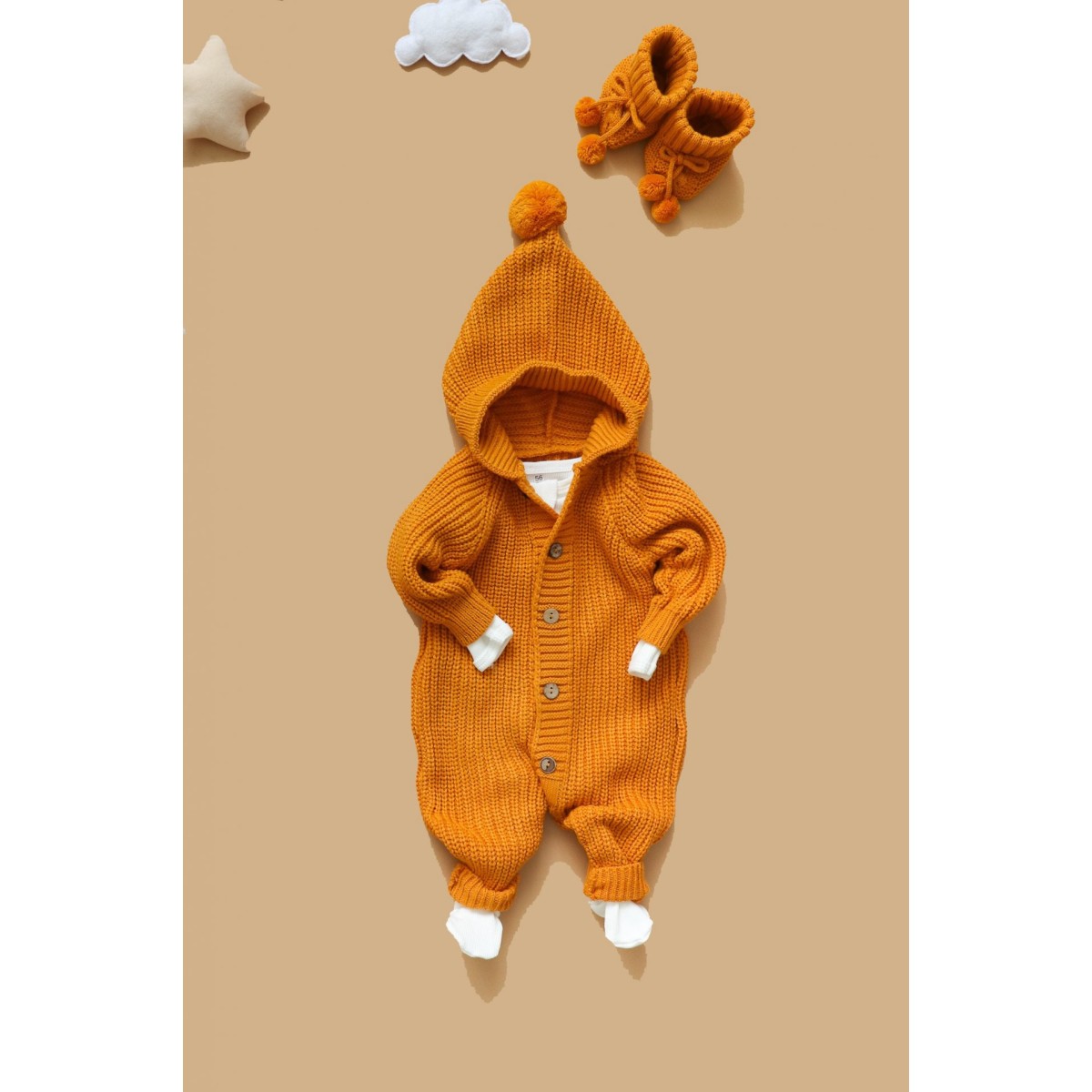 Вязаный детский комбинезон с капюшоном 56-68 см цвет: горчица В064