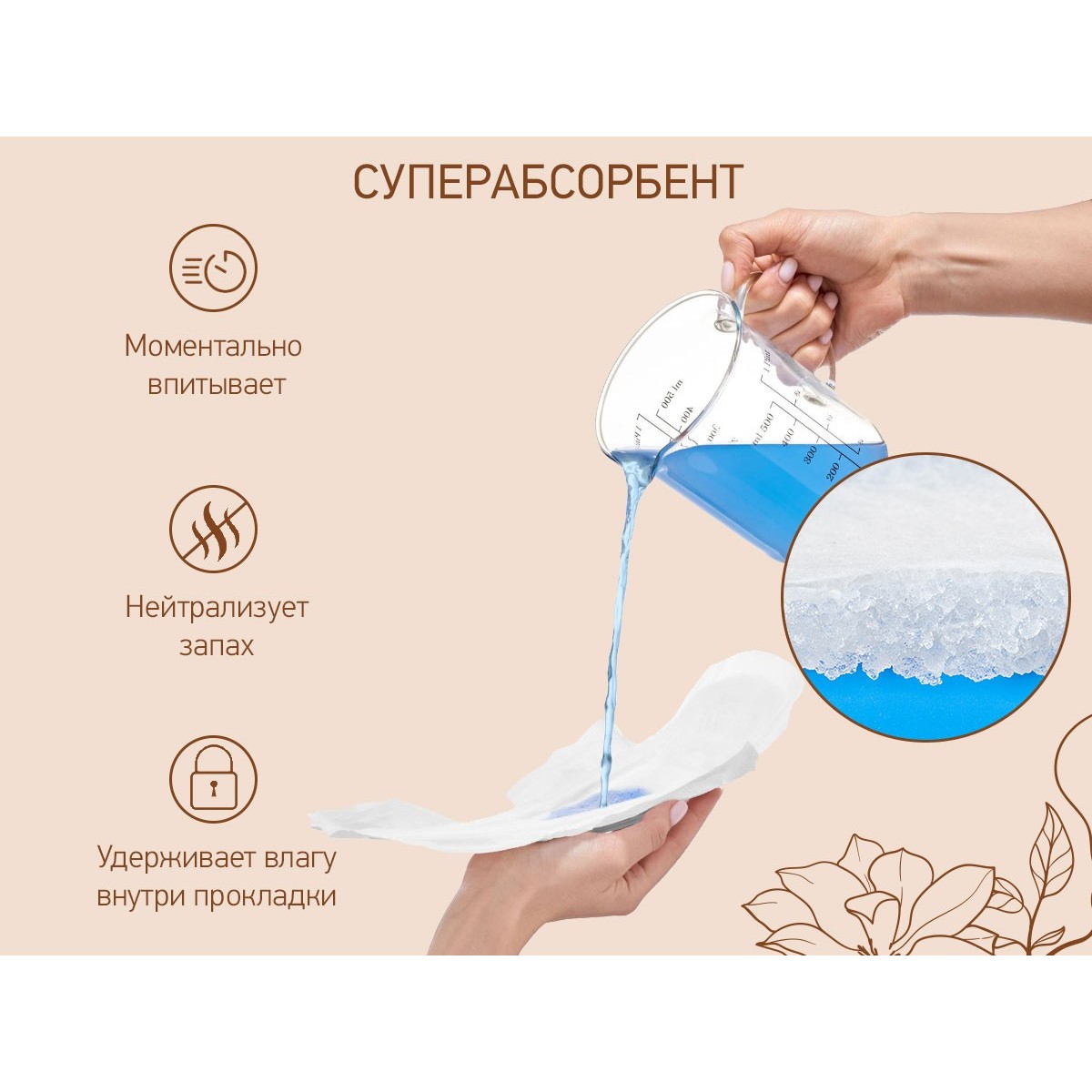 Материал: нетканый материал с содержанием хлопка, впитывающие микрогранулы суперабсорбента (SAP), натуральная целлюлоза, клеевой слой