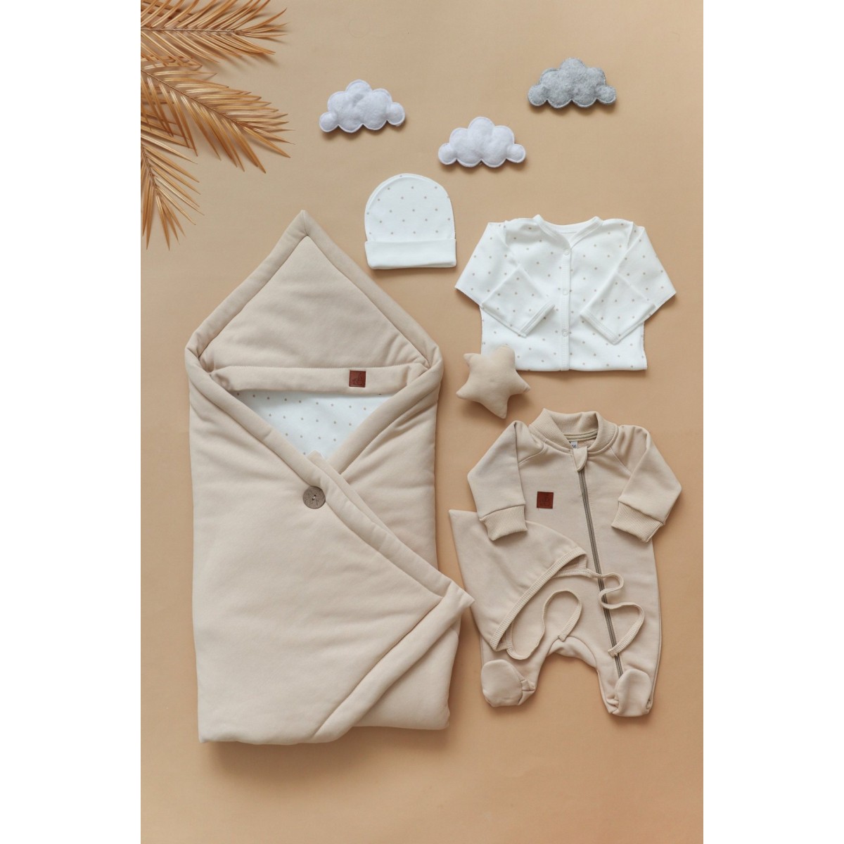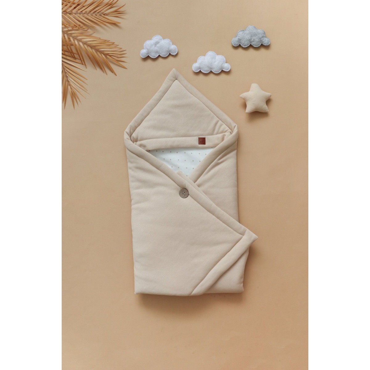 Одеяло легко трансформируется в конверт, фиксируясь на стильную крупную пуговицу. Конвертик хорошо держит форму, а еще его можно сложить несколькими способами, меняя образ. Уголок на конверте защитит головку малыша от ветра, а двустороннее одеяло всегда пригодится в кроватке или коляске.