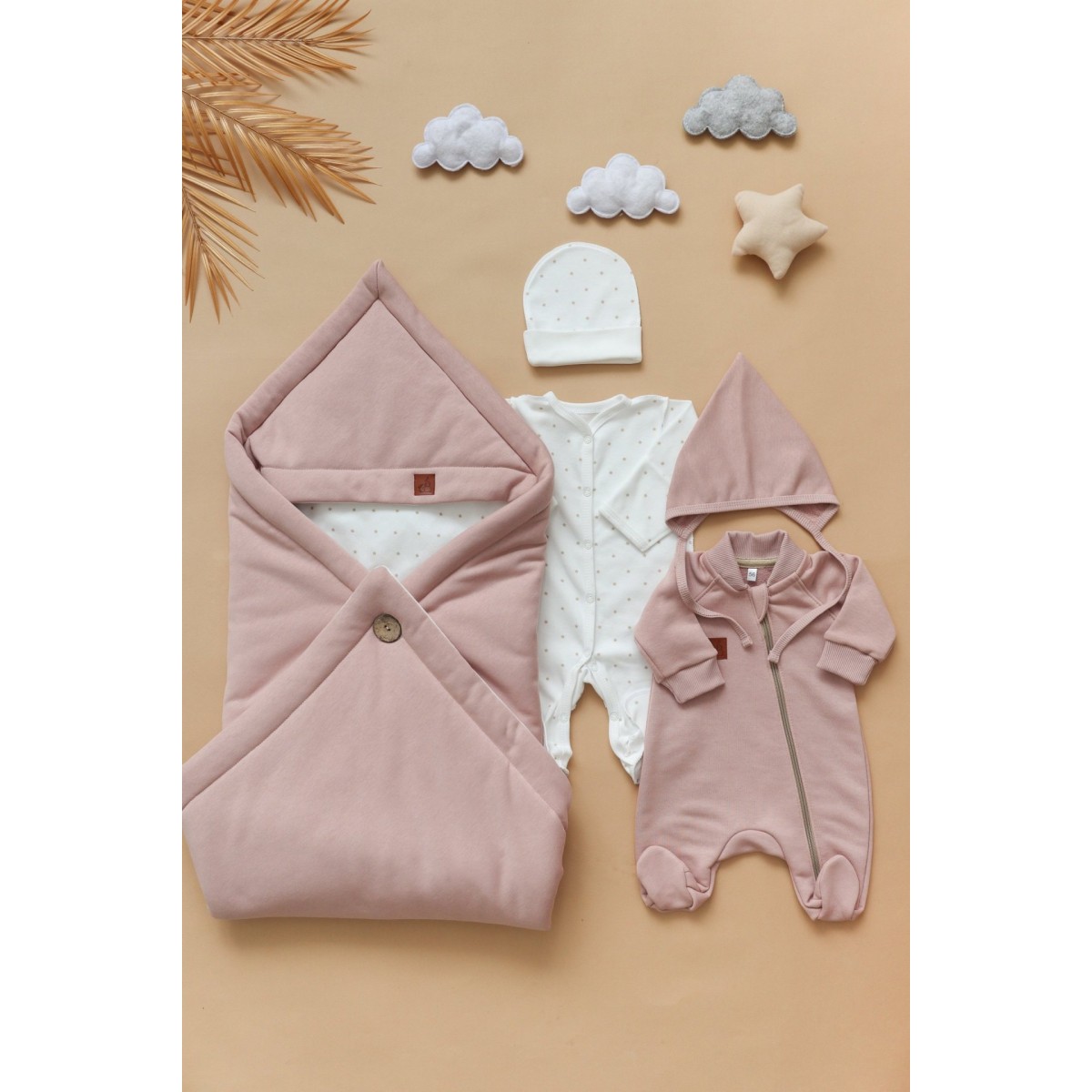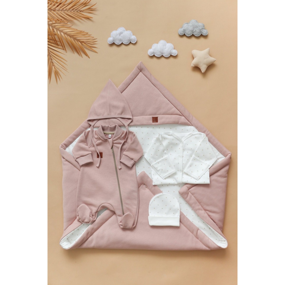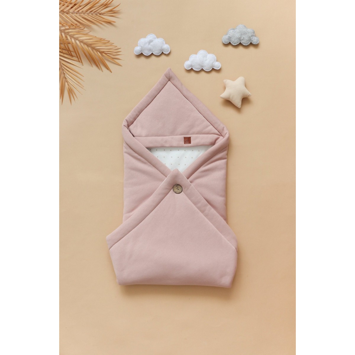 Одеяло легко трансформируется в конверт, фиксируясь на стильную крупную пуговицу. Конвертик хорошо держит форму, а еще его можно сложить несколькими способами, меняя образ. Уголок на конверте защитит головку малыша от ветра, а двустороннее одеяло всегда пригодится в кроватке или коляске.