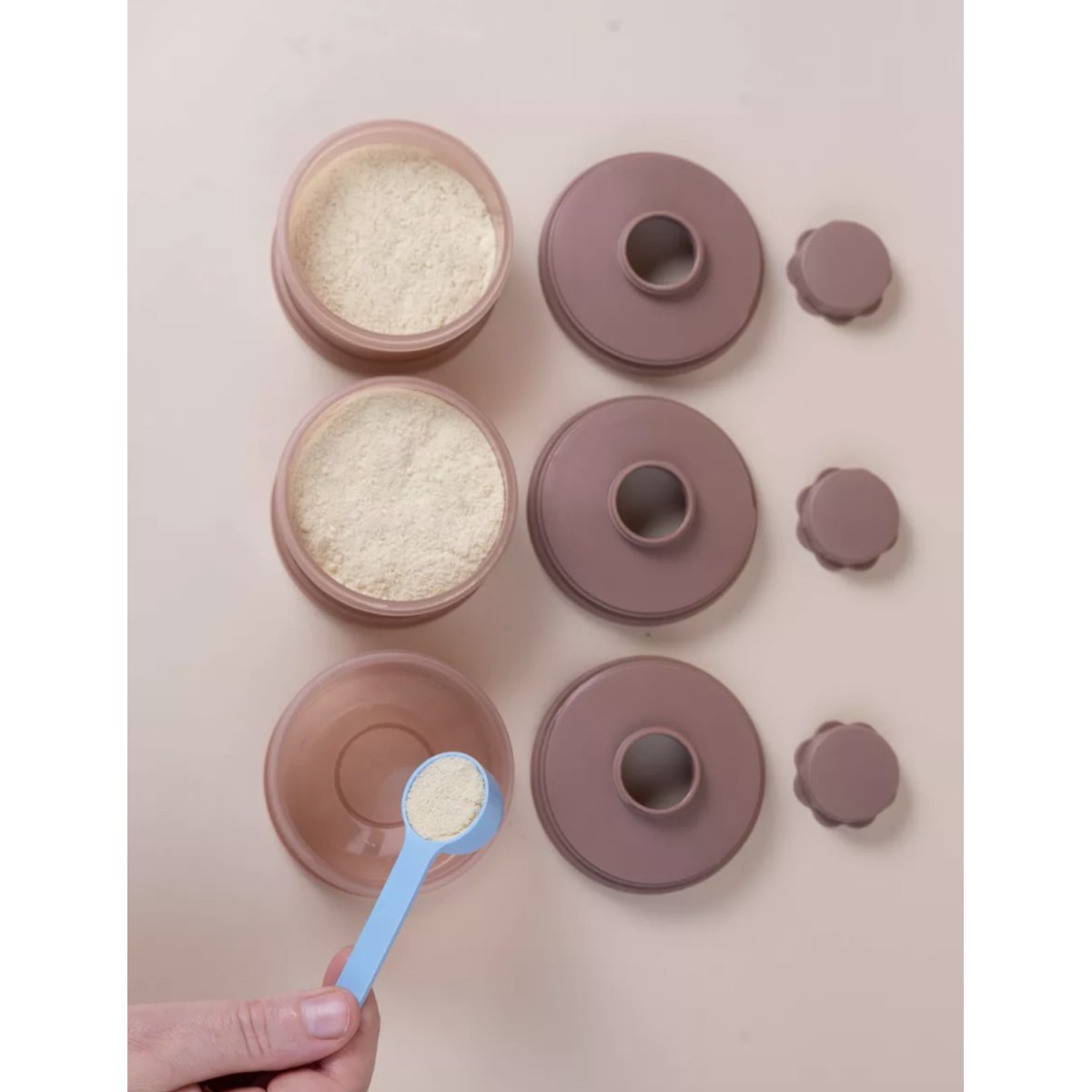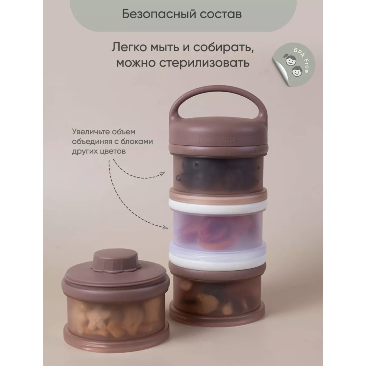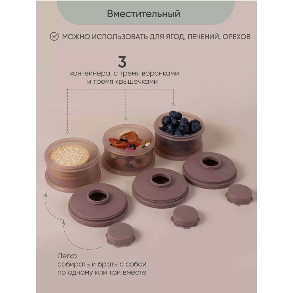 Контейнер для детского питания состоит из 3 отделений. Каждое отделение имеет специальную воронку с крышкой, что позволяет каждое отделение использовать отдельно и легко высыпать смесь в бутылочку. Контейнер удобно брать с собой в дорогу или подготовить несколько порций смеси для кормления на ночь. Широкий носик обеспечивает легкое и полное высыпание смеси из всех трёх отсеков. Крышка надежно закрывается. Каждый отсек контейнера вмещает 3 мерных ложки, 90 гр молочной смеси - отличный дозатор для детской смеси на улице, в гостях, ночью.