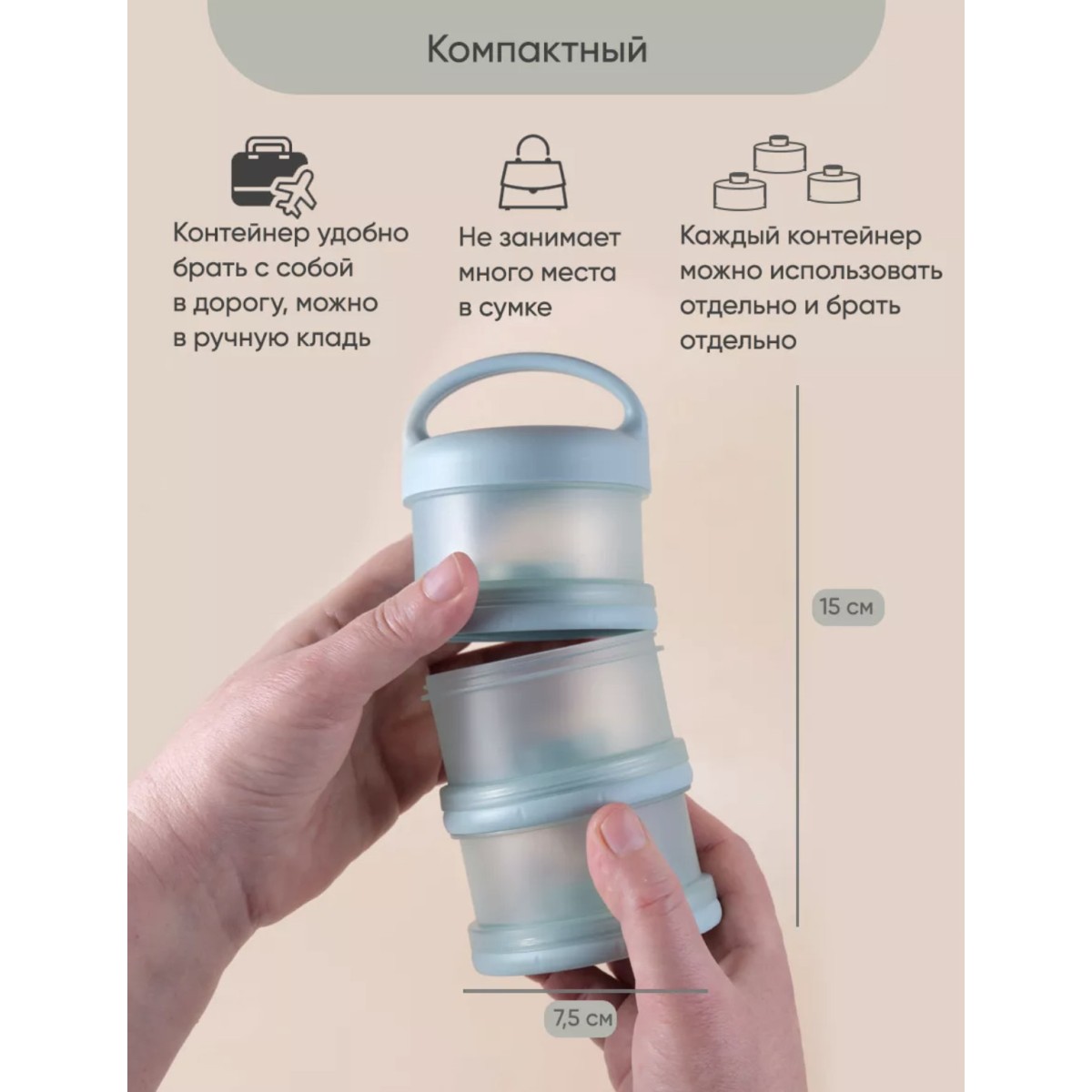 Контейнер для детской смеси эргономичный, имеет надежную силиконовую ручку для крепления или переноса. Благодаря своей форме, контейнер для детского питания устойчив и легко поместится в несессер , сумку или рюкзак и станет поистине незаменимым помощником родителям малыша.