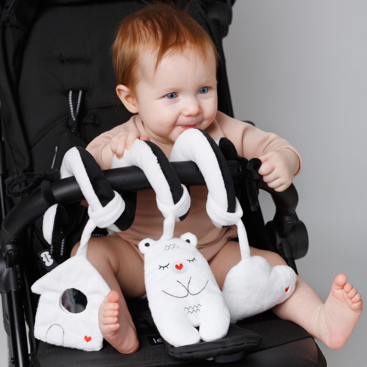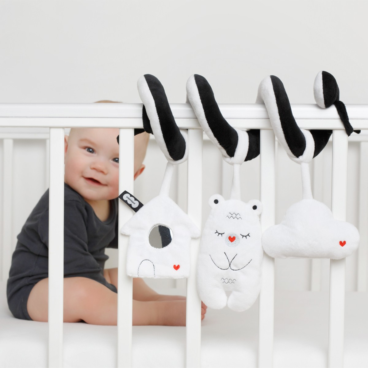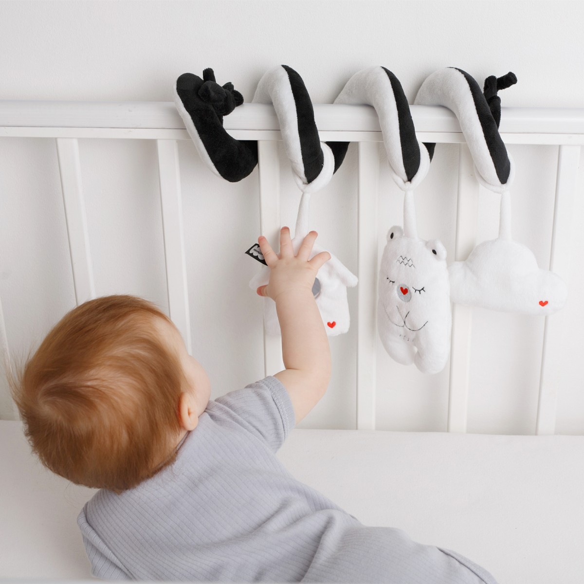 Мягкая черно-белая спираль для новорожденных занимает внимание малыша и способствуют его развитию с первых месяцев, так как сочетает в себе несколько игрушек сразу: мягкий домик с хрустящим элементом и безопасным зеркальцем, облачко с пищалкой и мишку-погремушку с деликатным звучанием, которые прикреплены к спирали-змейке. Погремушки помогут ребенку развить слух и мелкую моторику рук. Также мягкая спиралька справится с зудом малыша при прорезывании зубов.