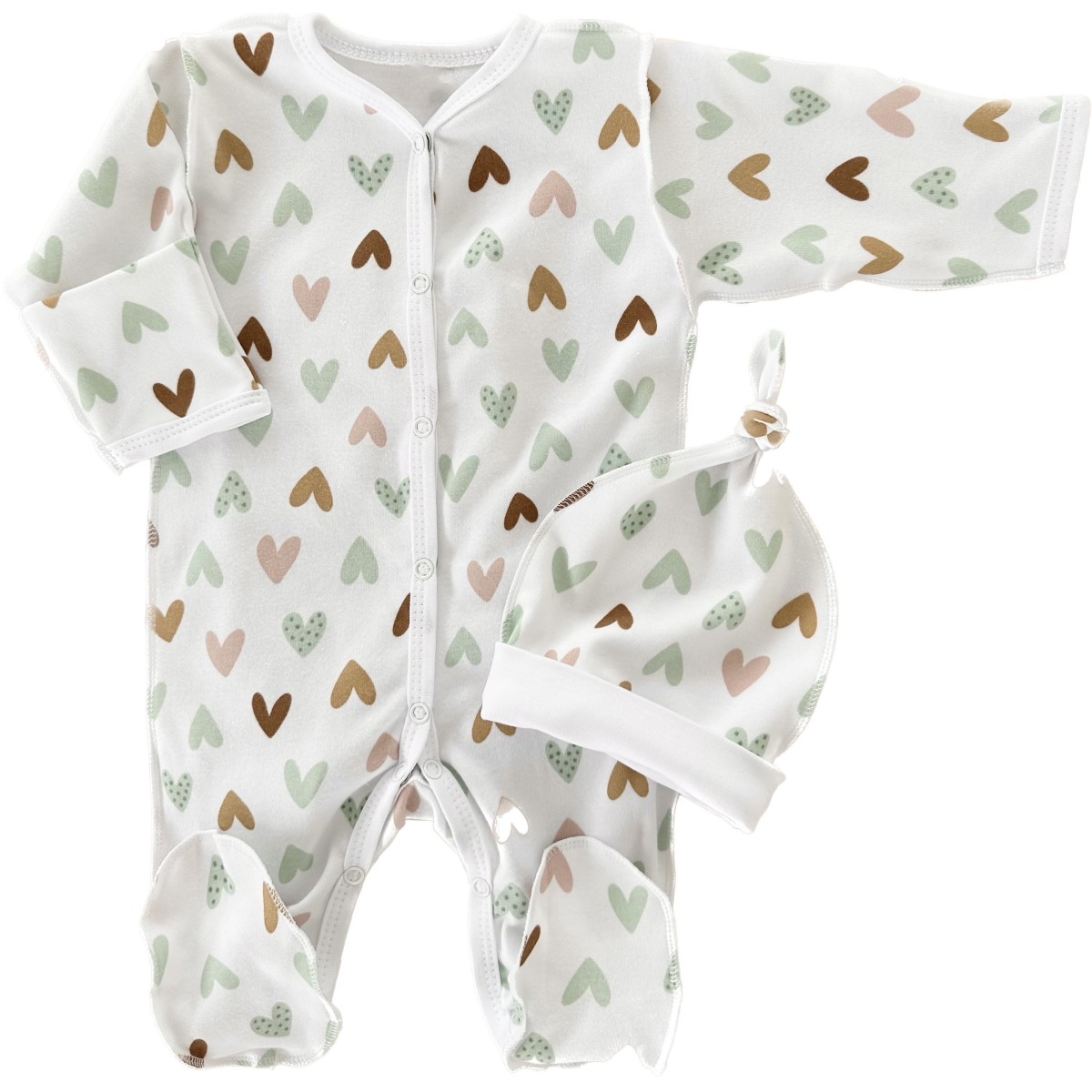 Комплект: Слип на кнопках + шапочка-узелок со швами наружу 50 см Newborn "Сердечки Т-097