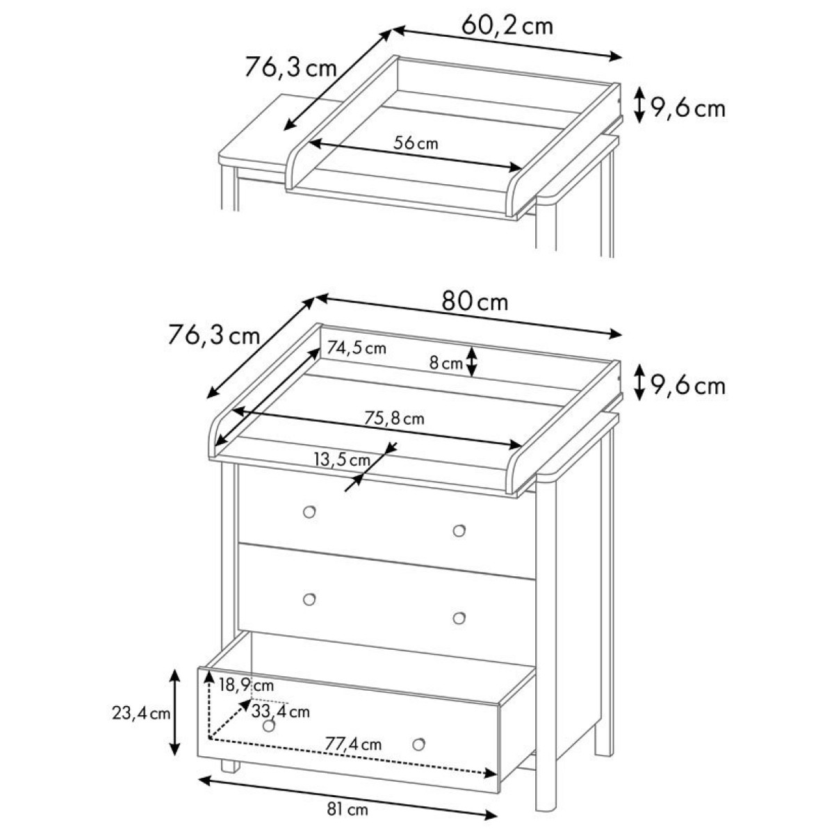 Когда потребность в пеленании малыша отпадает, то рамка легко снимается, освобождая место для хранения вещей на топе комодов.