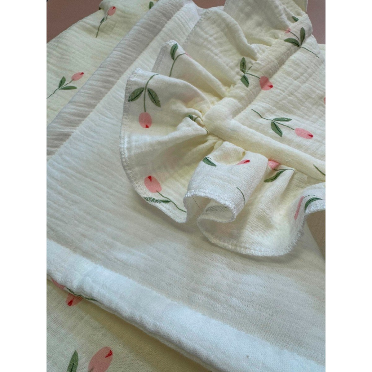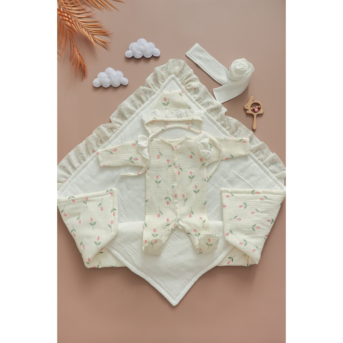 Муслиновый комплект на выписку и прогулки 4 предмета цвет: тюльпаны 0404/молочно-розовый
