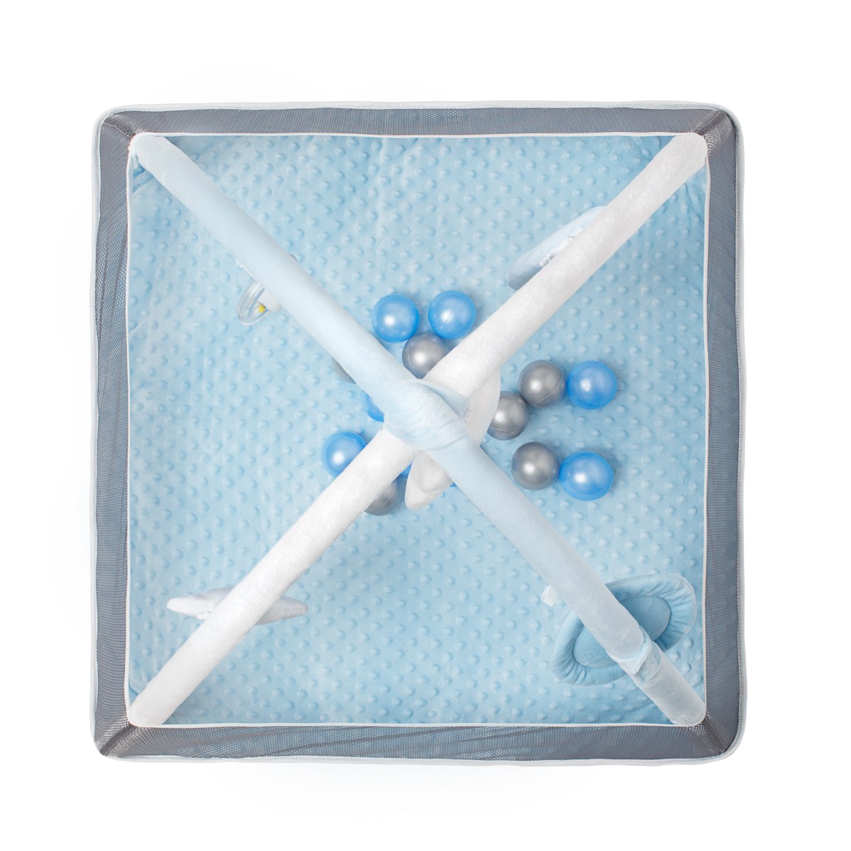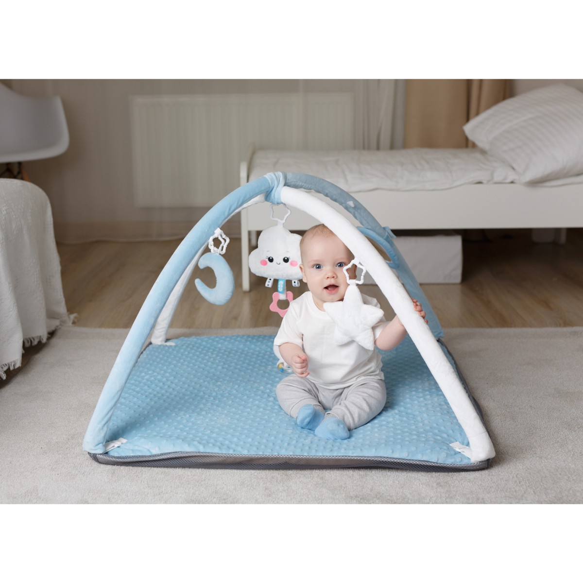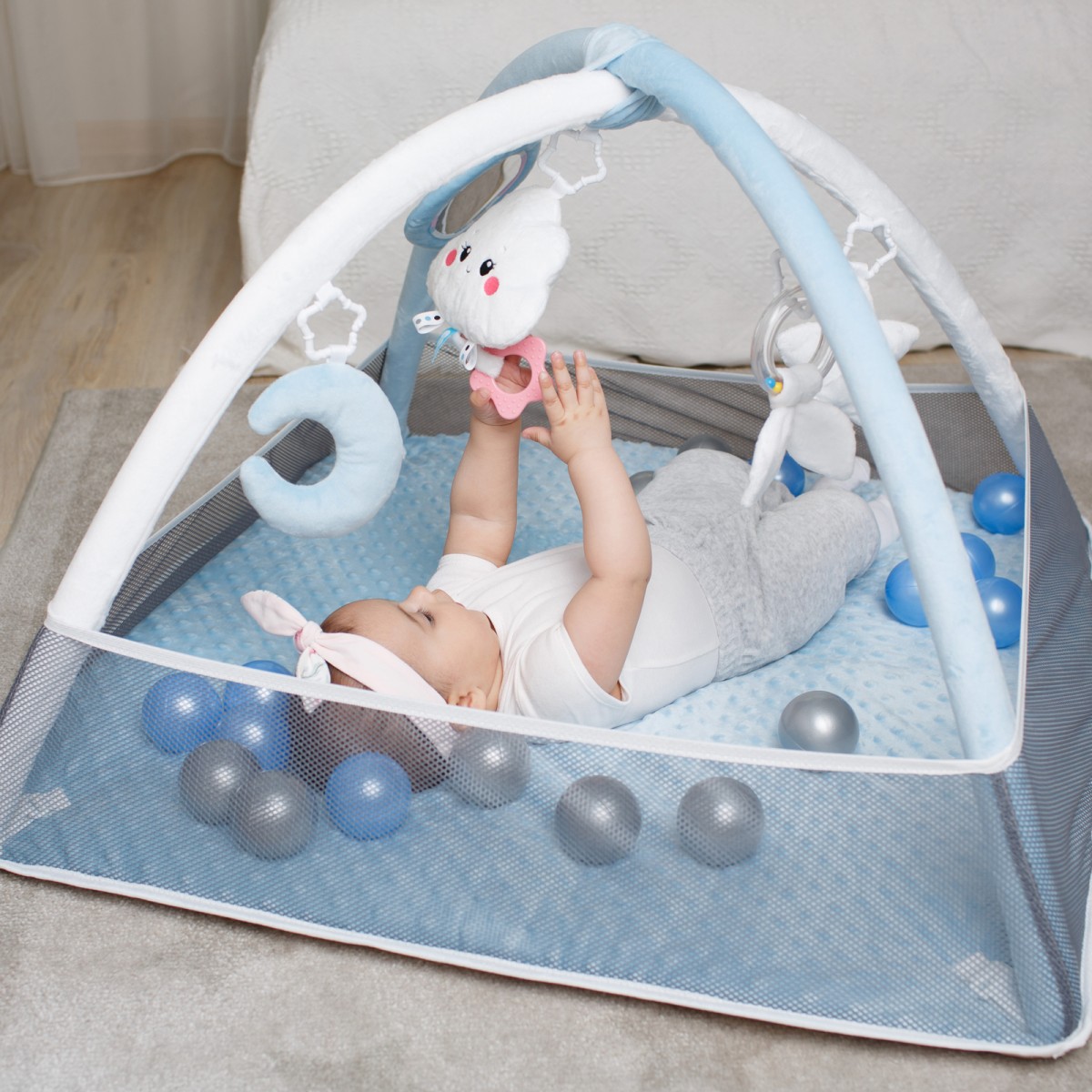 Погремушка в виде облачка с грызунком-прорезывателем будет особенно актуальна в период активного роста зубов. Мягкий голубой полумесяц приятен на ощупь и способствует развитию мелкой моторики. Безопасное зеркальце позволит изучить себя. А звездочка с пищалкой и колечко с хрустящими листиками поспособствует в изучении звуков. В комплект также входят 18 шариков синего и серого цвета, которые интересно перебирать и катать. Детский складной коврик удобно брать с собой - все дуги и игрушки снимаются, основание компактно складывается.