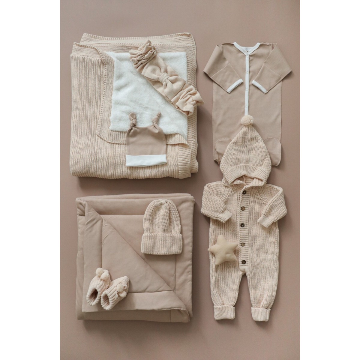 -вязаный комбинезон на пуговицах с капюшоном, можно регулировать по росту за счет мягких манжетов. (56-68 см, с рождения до 6 месяцев)