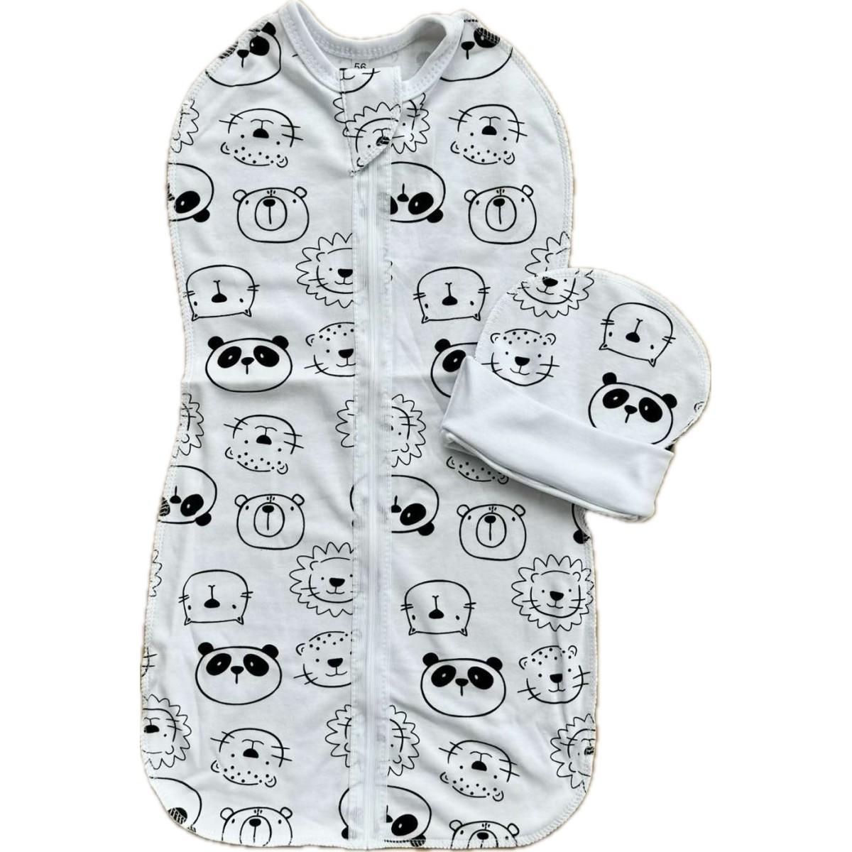 Пеленка-кокон на молнии с шапочкой 56-62 см принт: пандочки и львята Т-007