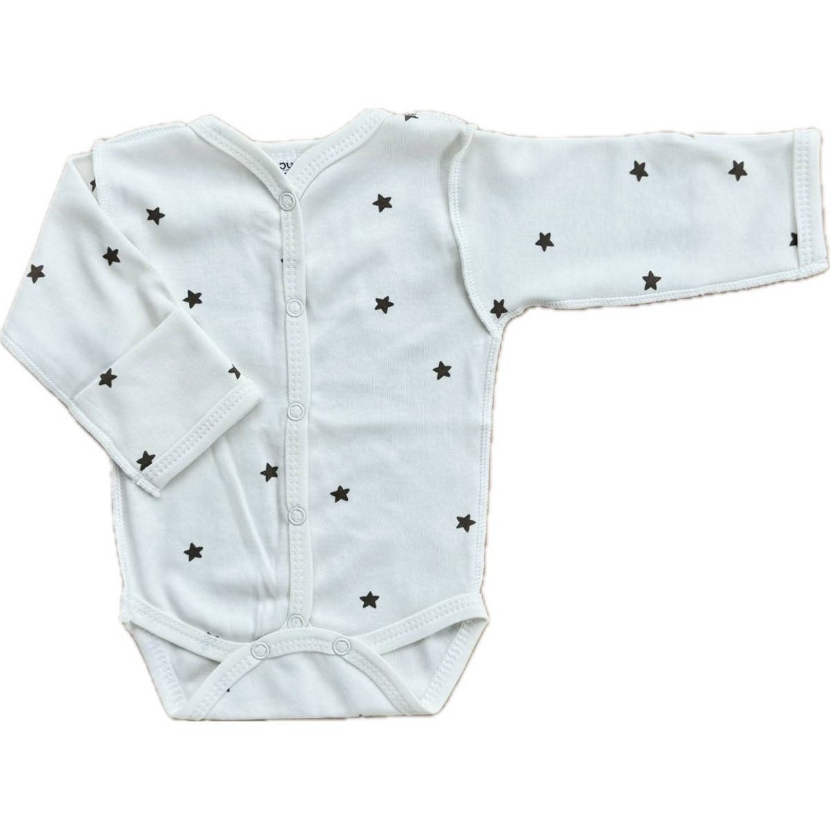 Полностью на кнопках, очень удобно одевать, не нужно лишний раз тревожить кроху , одевая боди через голову : просто расстёгиваете боди сверху донизу , кладёте малыша и застёгивайте . Со швами наружу и отворотными ручками-антицарапками.