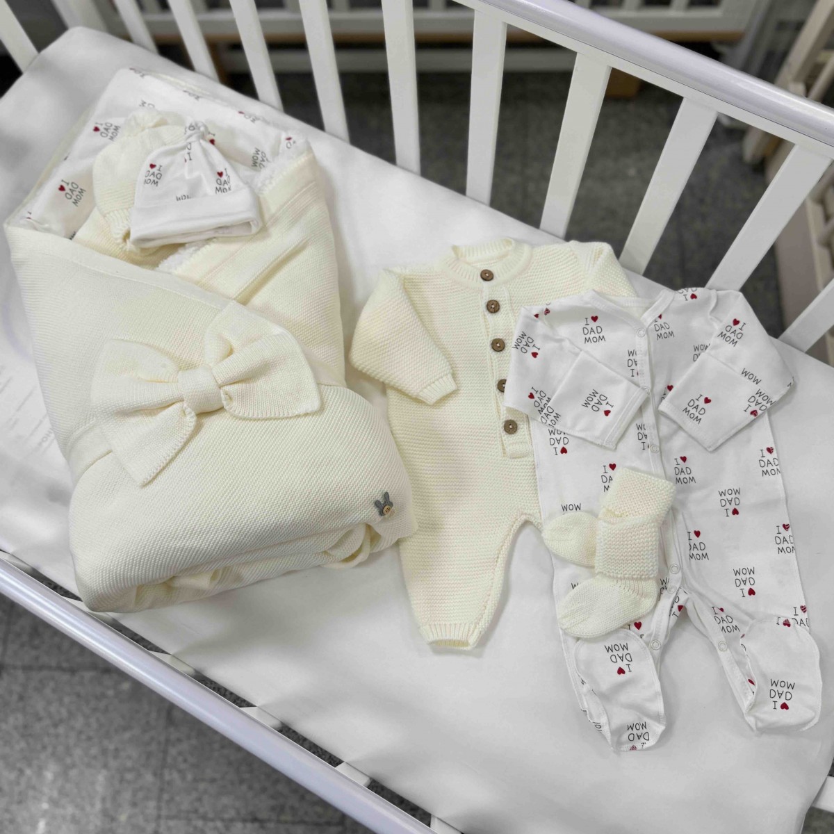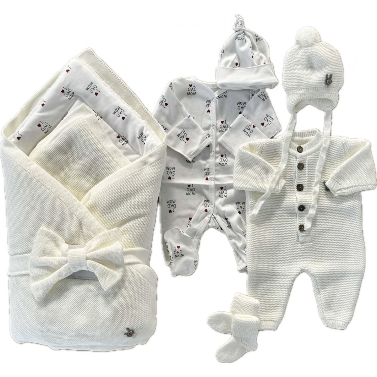 Комплект на выписку из роддома 8 предметов "ALPACA" цвет: молочный / I love mom&dad 0363