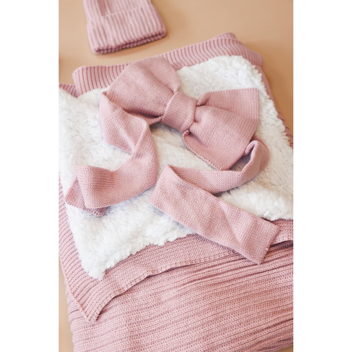 Красивое вязаное полотно на пледе с одной стороны, мягкая шерпа с другой стороны. В тон подобраны вязаный комбинезон, шапочка, носочки и пояс-бант для фиксации конвертика.