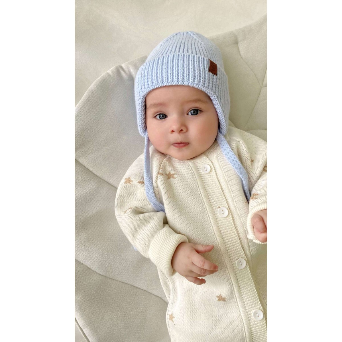 Красивая стильная вязаная шапочка из импортного мериноса. Хорошая посадка по голове малыша, хлопковая подкладка внутри шапочки позволяет носить ее не поддевая чепчик или хлопковую шапочку. Модель идет с завязками.