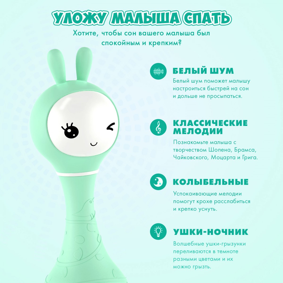 • ВОЛШЕБНЫЕ УШКИ. Они сделаны из мягкого и безопасного силикона и переливаются в темноте разными цветами. Но я не просто ночник, мои мягкие ушки можно грызть.