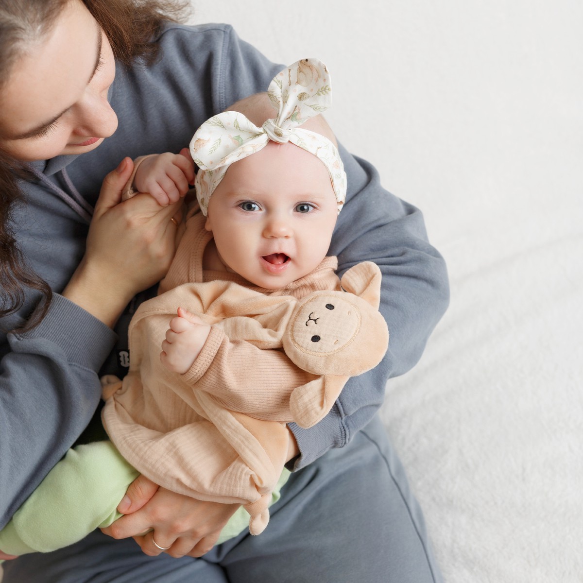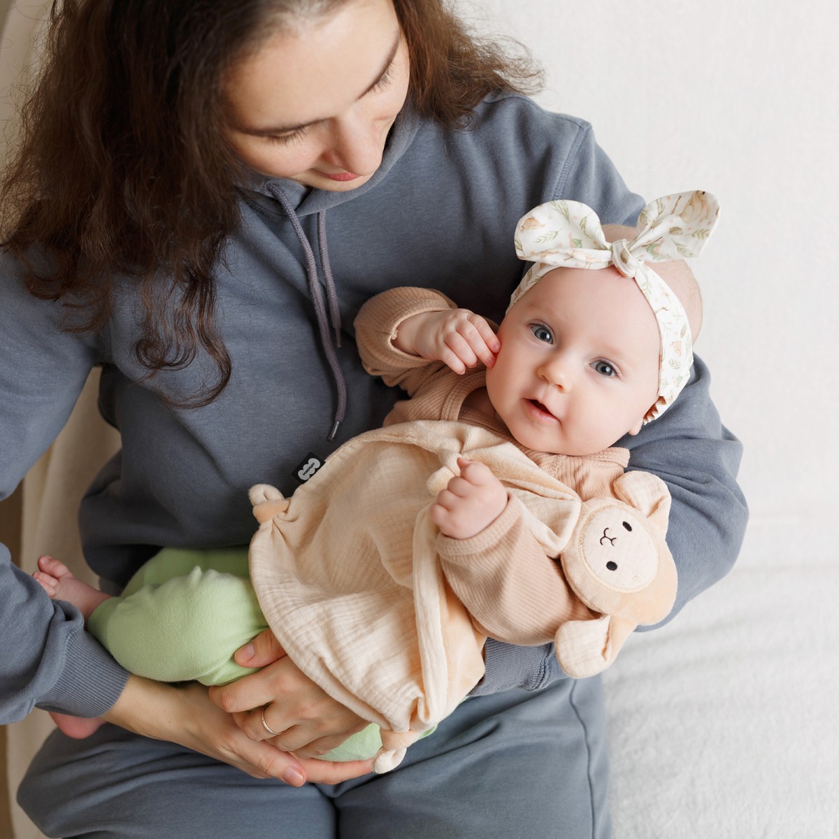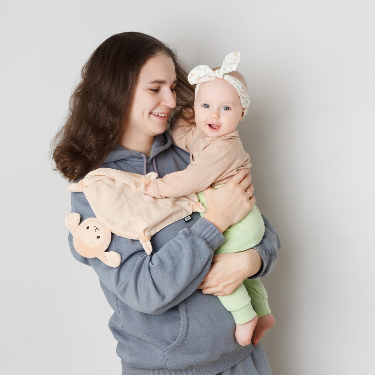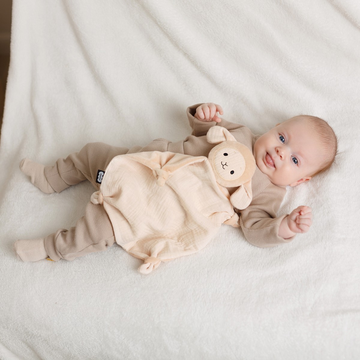 Игрушка для сна новорожденных Овечка Берта в бежевых оттенках — это первая и самая важная игрушка для малыша. Созданная для самых сладких и крепких снов младенца, овечка цвета топленого молока выполнена из премиальных материалов – животик, мордочка и ушки сделаны из нежного муслина, а спинка из нежного меха. Мягчайшие материалы не раздражают кожу новорожденного. Взаимодействуя с мягким комфортером, ребенок осваивает важнейшие навыки самоуспокоения и учится засыпать самостоятельно. Теперь не придется считать овец для засыпания – нужна всего одна! А во время бодрствования комфортер отлично подойдет для активных игр – его приятная фактура ткани и вышивки поможет в развитии тактильного интеллекта и мелкой моторики. Разные ткани развивают тактильное восприятие. Использовать плюшевую зверушку для новорожденных легко — ее следует носить ближе к телу и прикладывать во время кормления и укачивания. Также можно класть в кроватку, коляску или автокресло. Мягкая ткань впитает родной запах мамы, и младенец всегда будет ощущать ее присутствие. Знакомая и любимая с первых дней жизни игрушка позволит малышу успокоиться в незнакомых ситуациях — на приеме у врача, в гостях или в магазине. Милая мордочка вызовет интерес у детей. Мама может придумать сказку или просто рассказать ребенку, как разговаривает овца, где у нее ушки, лапки, глазки, носик, ротик. Стильный дизайн в актуальных пастельных тонах придется по душе современным и динамичным мамам. Нежная и функциональная игрушка-антистресс выполнена из гипоаллергенных материалов, которые безопасны для новорожденных. Берта легко стирается при 30 градусах в режиме деликатной стирки и сохраняет цвет и форму. Очень важно, что по мере взросления ребенка, сплюшка сможет стать просто любимой игрушкой-талисманом. Будет замечательным подарком на любой праздник и как сюрприз в обычный день.