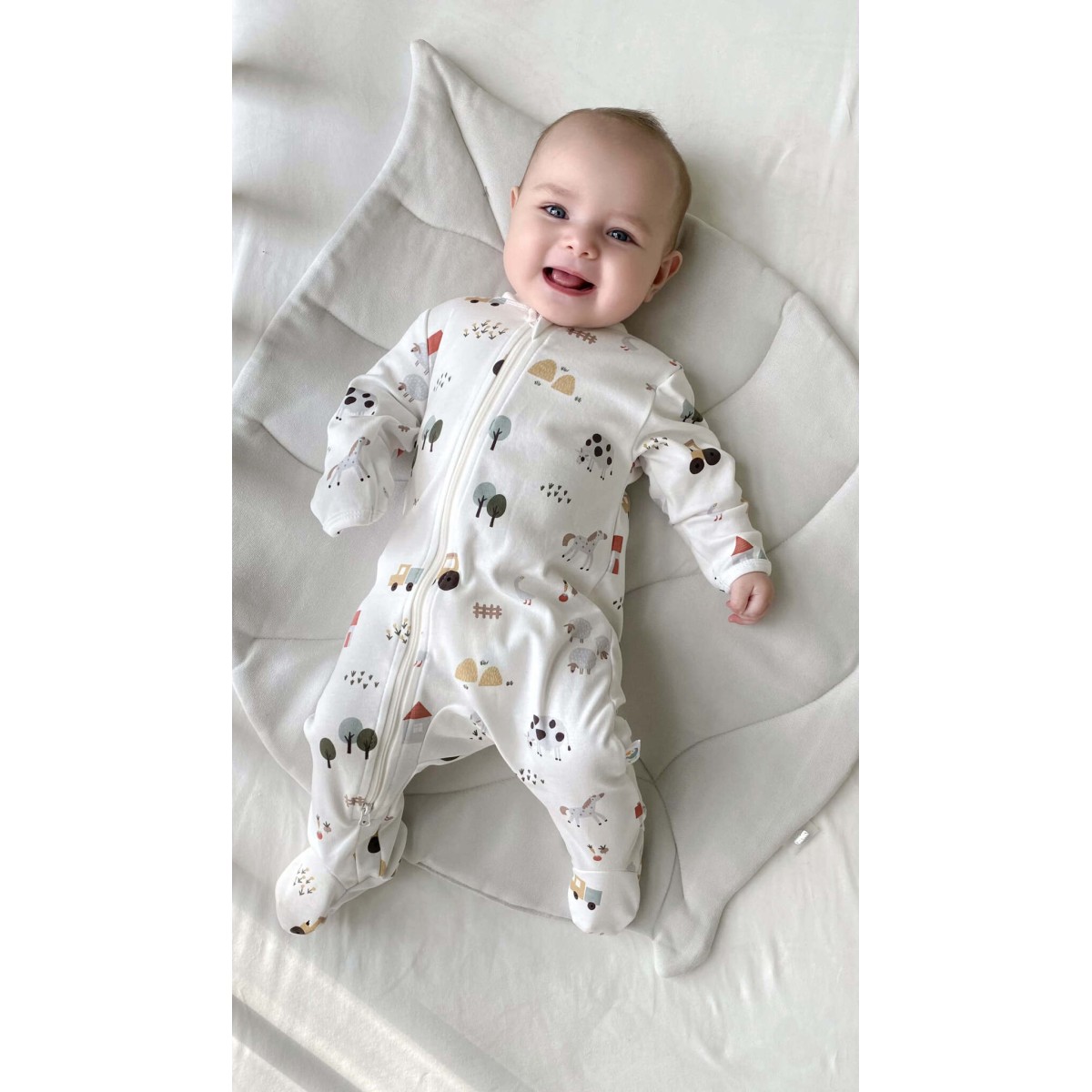 Комфортный слип на молнии из 100% хлопка, имеющего международный сертификат OEKO-TEX (экологичность производства ткани). Модель с двумя бегунками для легкого переодевания малыша.