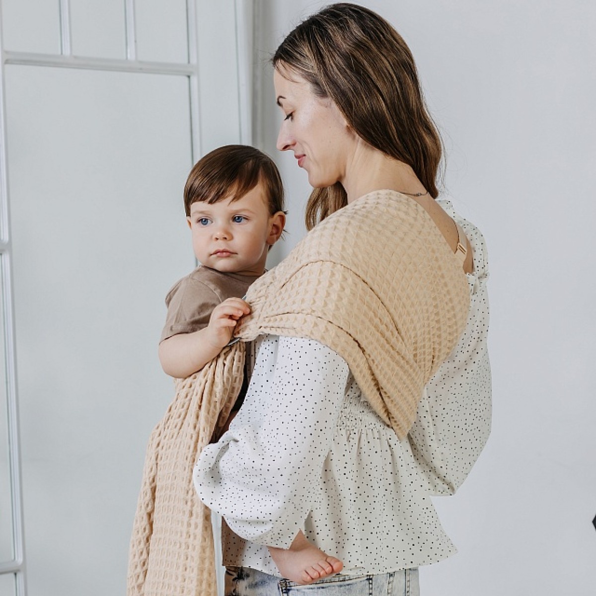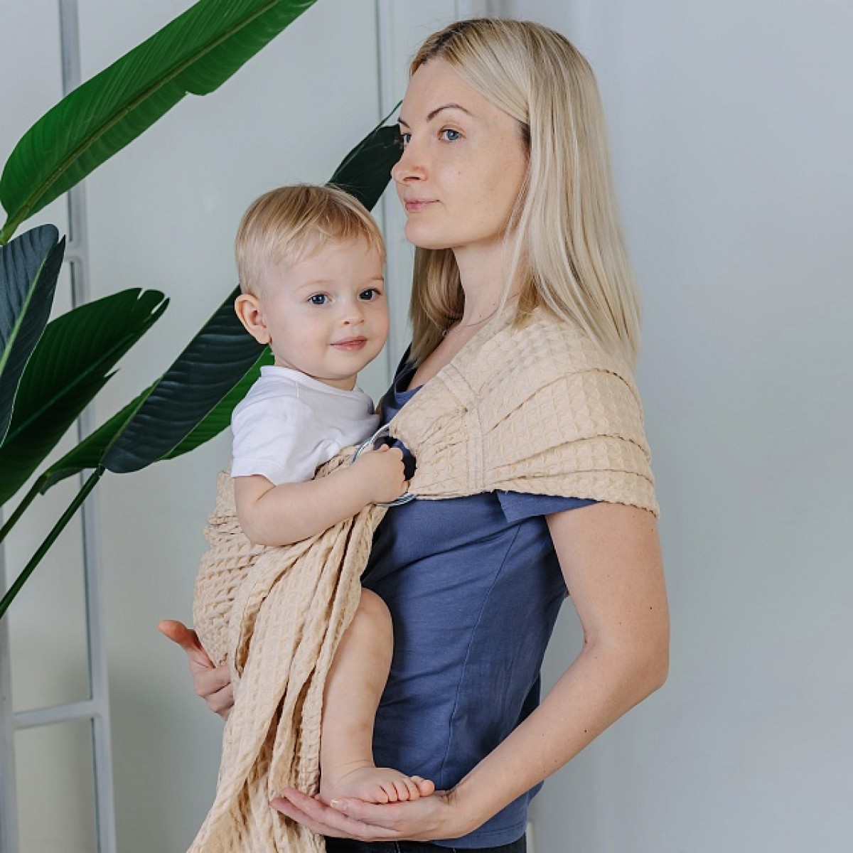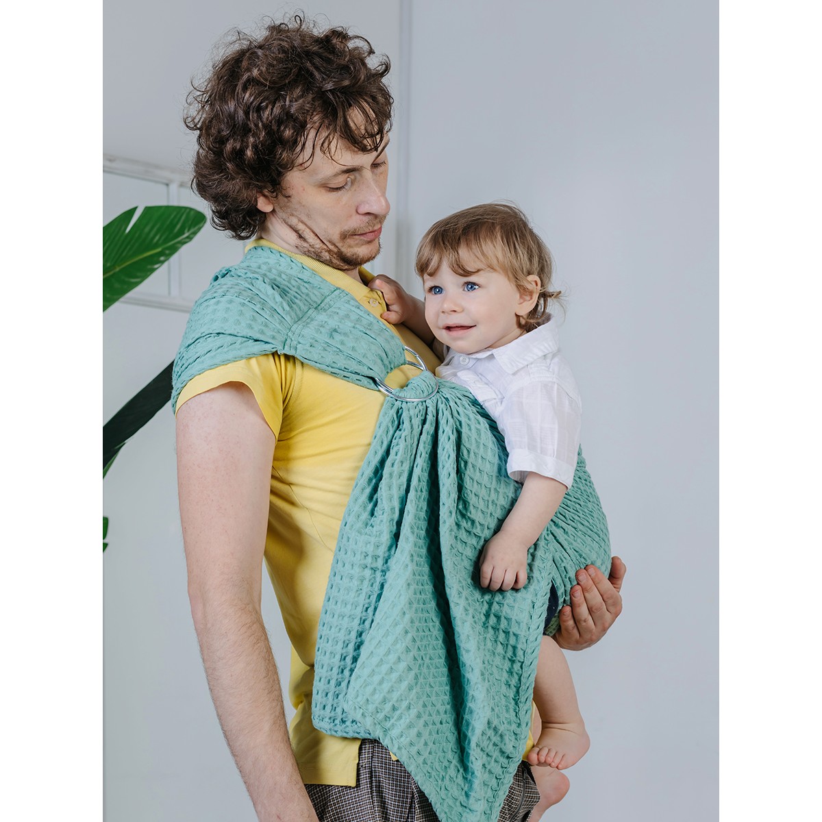Мягчайший слинг для новорожденного из вафельной ткани. Ткань слинга имеет потрясающее диагональное движение нитей – лучше, чем у некоторых жаккардовых тканей. В слинг установлены самые надёжные кольца - сварные, стальные, никелированные. Даём гарантию, что они не расколются от неаккуратного обращения. Также это позволяет не увеличивать без нужды стоимость слинга.