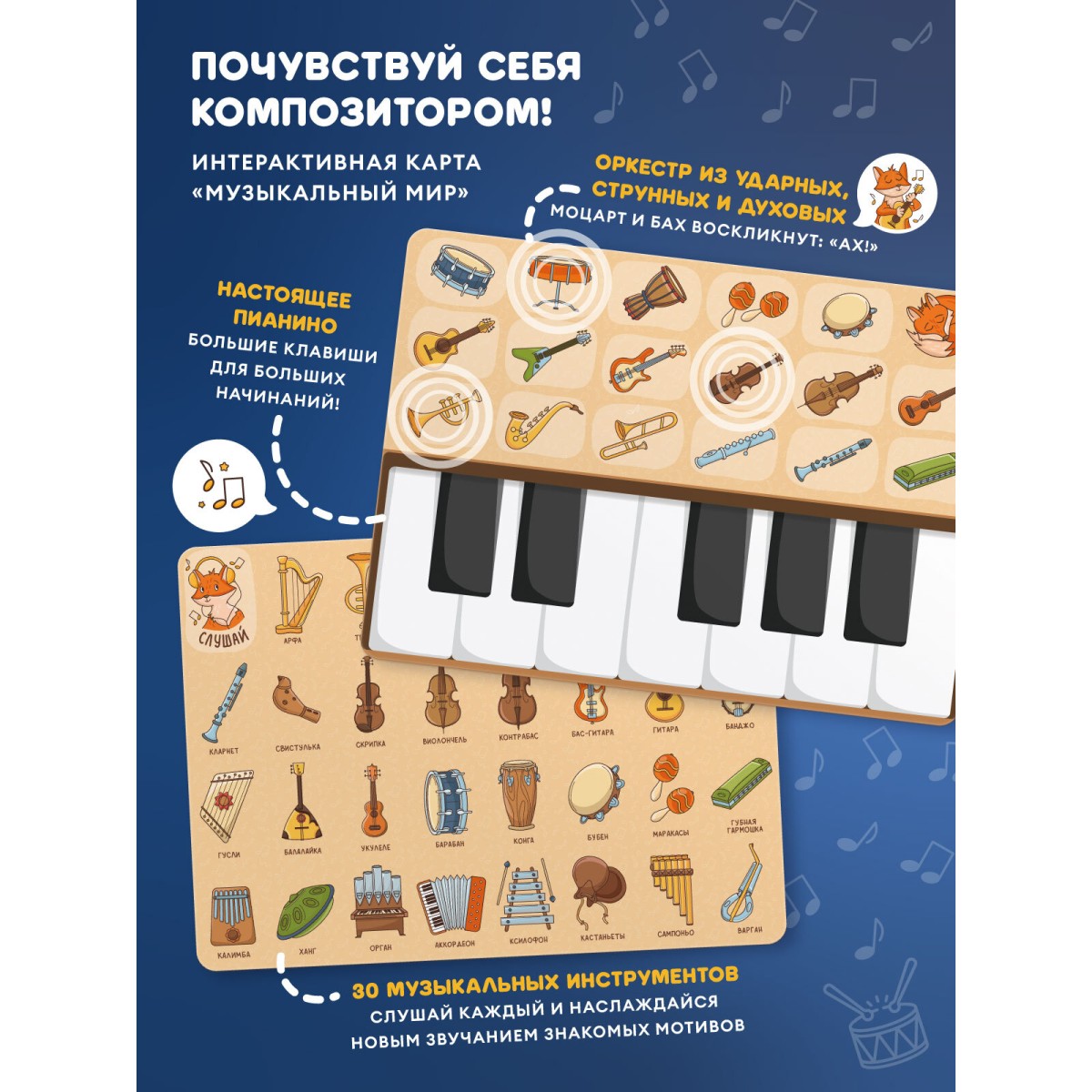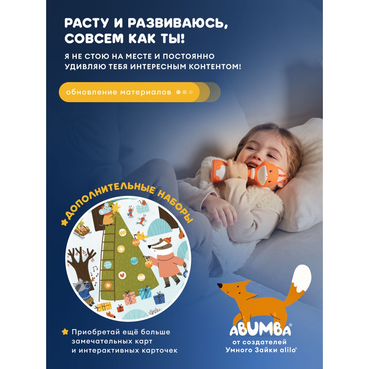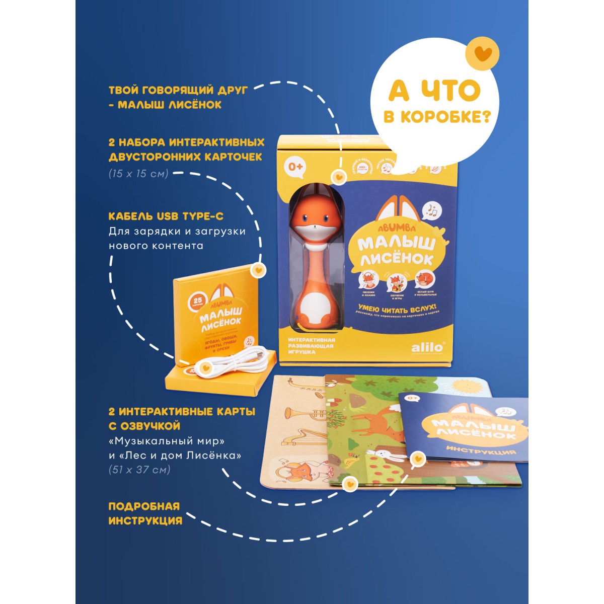 Я похож на любимого старшего брата – Умного зайку alilo: мы из одной семьи! Хотя и у нас есть различия. Во-первых, я всё-таки лисёнок. Во-вторых, меня придумали и нарисовали в Санкт-Петербурге. В-третьих, две кнопки, чтобы с удобством переключать контент и пользоваться меню. В-четвёртых, я обладатель замечательной памяти: целых 4 Гб! В-пятых, любовь к говорению: с удовольствием озвучиваю картинки с карточек и карт из комплекта, которые одновременно обучают и развлекают. - Карты «Дом Лисёнка» и «Музыкальный мир». Ставьте меня на красочные иллюстрации, а я буду рассказывать про свой домик, друзей, особенности леса и проигрывать звуки музыкальных инструментов. Миксуйте, комбинируйте, составляйте полноценные мелодии! - Наборы карточек «Цвета, формы и свойства» и «Ягоды, овощи, фрукты, грибы и орехи». Поставьте мою фигурку на конкретную карточку, и я поведаю, что на ней изображено. Идеально для самостоятельного изучения. В компании со мной, конечно! - Дополнительные наборы и обновление контента. Приобретайте новые замечательные карты и интерактивные карточки и узнавайте больше занимательных фактов и необыкновенных историй. - Весёлые песенки. 30 песен на русском и английском, среди которых любимые произведения авторства В. Я. Шаинского. Со мной не заскучаешь! - Поучительные сказки. 22 добрые истории, и я рассказываю их голосами настоящих актрис театра и кино. - Белый шум. 45 минут белого шума и дополнительно 9 успокаивающих звуков помогут малышу успокоиться и быстро уснуть. - Погремушка. Откроем мир звуков: узнаем, как говорят животные, как играют музыкальные инструменты и как звучит природа. - 4 Гб памяти. Загружайте собственный контент! - Волшебные ушки. Сделаны из мягкого и безопасного силикона, нежно светятся в темноте. Можно грызть и дёргать! Что ещё добавить? Скорее дарите меня детям, я их обожаю!