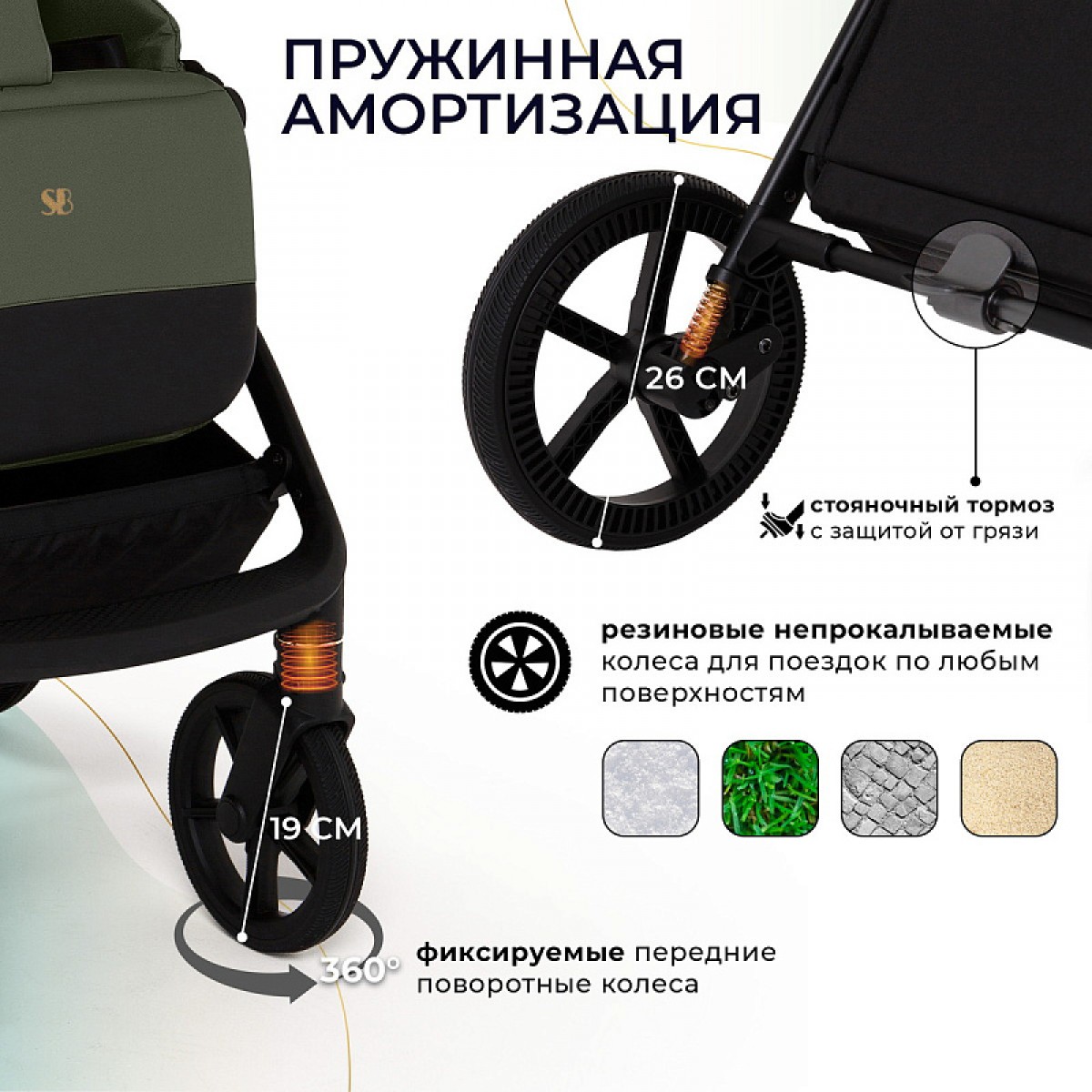 Пружинная амортизация на всех колесах. Теперь прогулки по неровным поверхностям станут мягкими и плавными. Ваш малыш не ощутит ни малейшего дискомфорта, даже на сложных маршрутах.