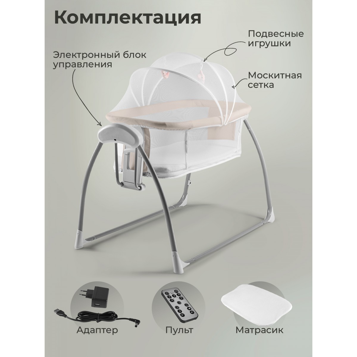 Богатая комплектация: в комплект входят: пульт ДУ, адаптер, москитная сетка, подвесные игрушки, мягкий матрасик из хлопка, электронный блок управления.