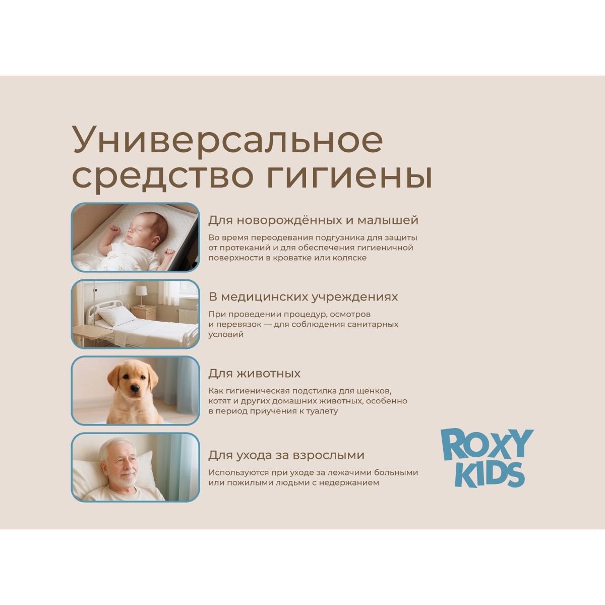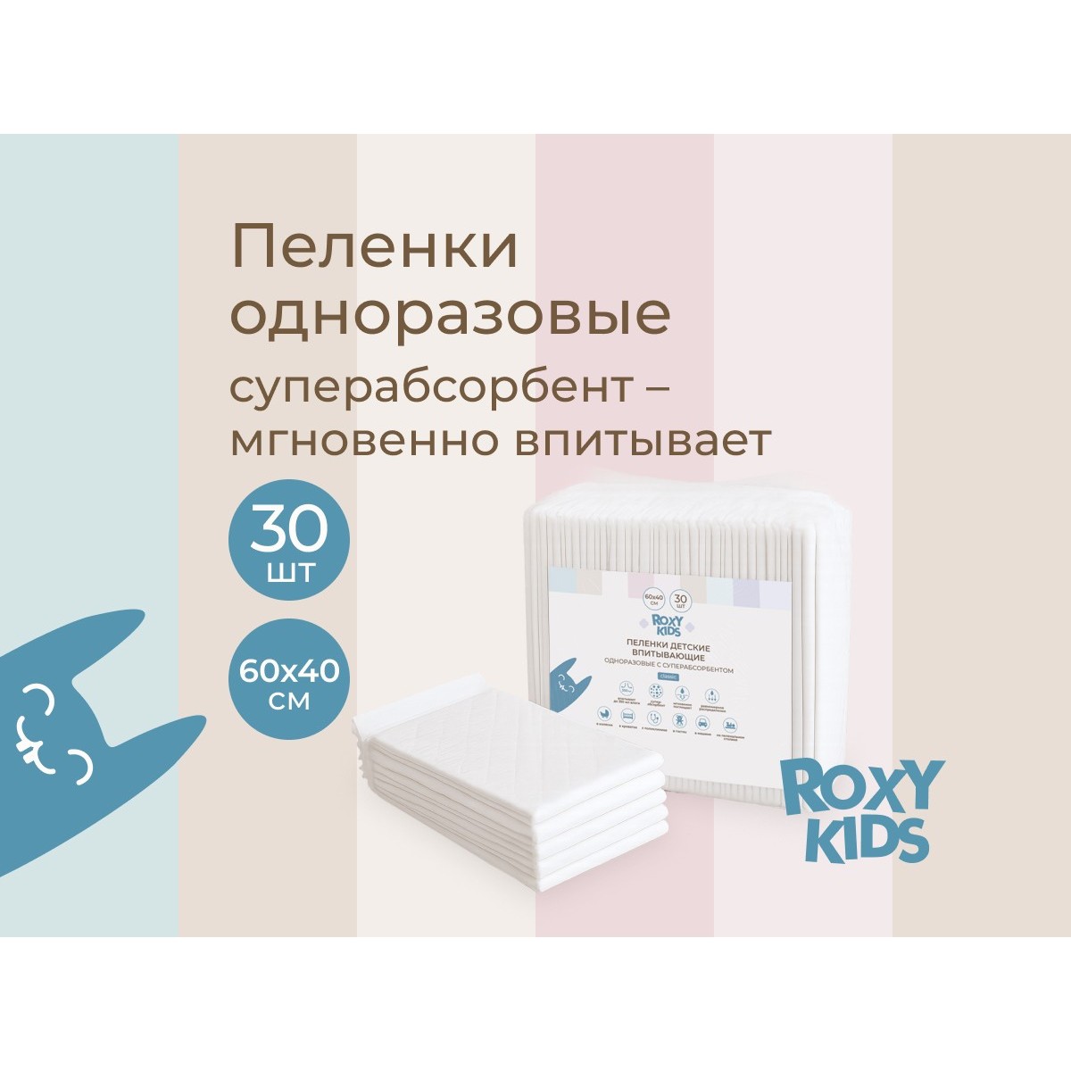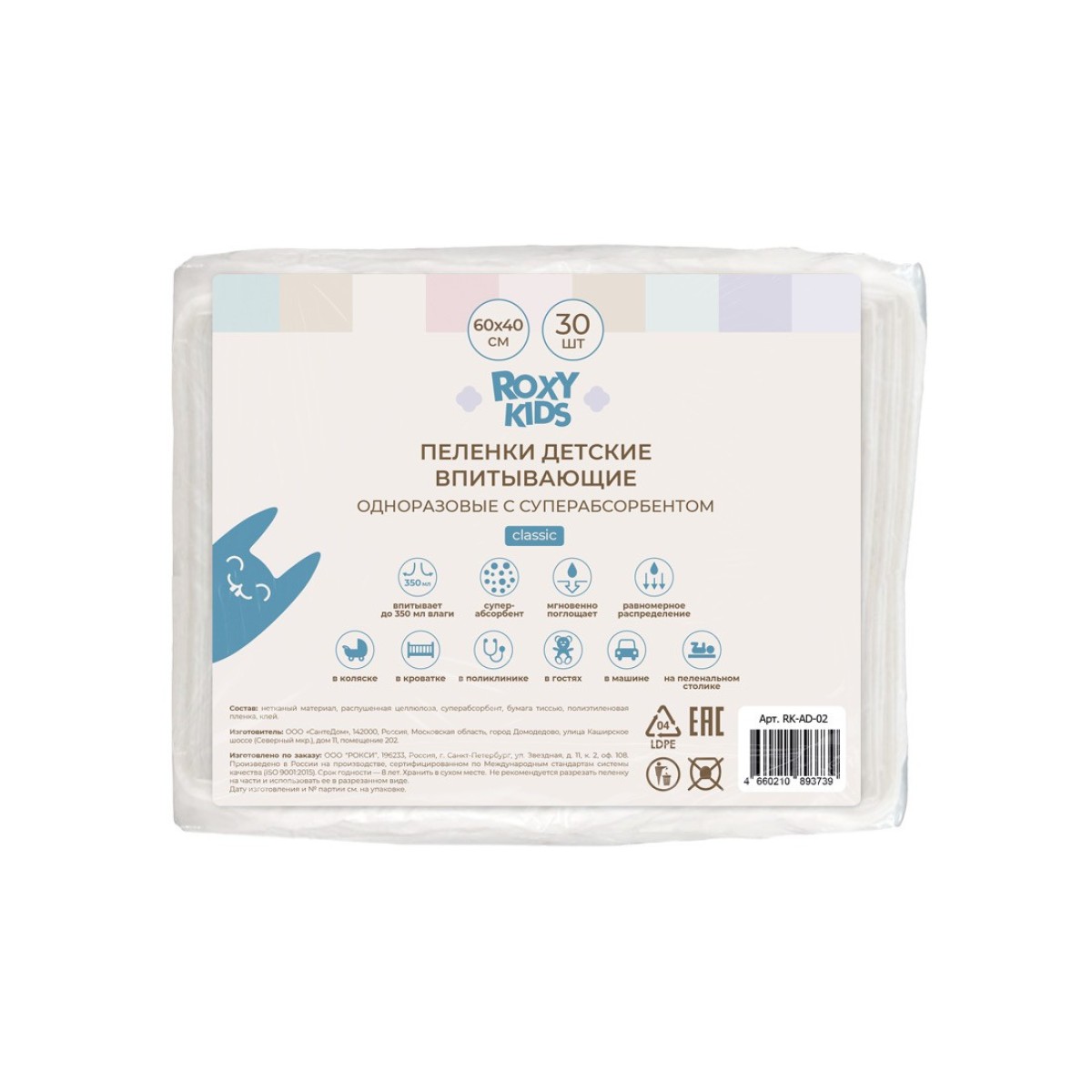 Имеют универсальный размер — 60х40 см, и подходят для использования в самых разных ситуациях: дома на пеленальном столике, в кроватке, в коляске, в гостях, в машине или во время визита к врачу