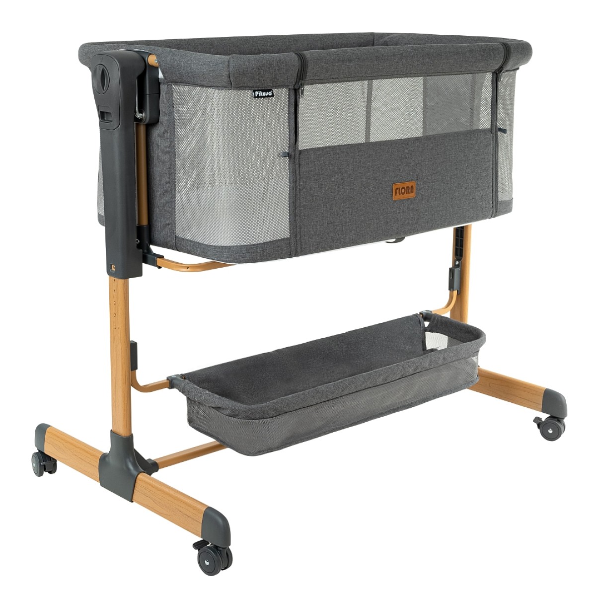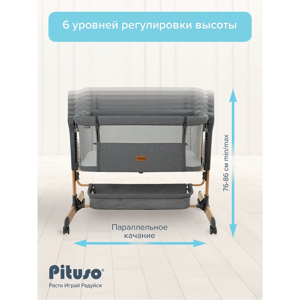 Приставная колыбель Pituso Flora имеет безопасную систему крепления к кровати родителей и позволяет вам спать рядом с малышом. Уникальная связь между малышом и родителями будет еще сильнее, а ночи – спокойнее! С колыбелью можно не беспокоиться о самочувствии младенца по ночам, ведь теперь вы сможете покормить и успокоить малыша, когда бы он ни проснулся. Также мама может приподнять изголовье ложа, что улучшит дыхание малыша во время простудных заболеваний и снизит риск срыгивания после кормления. Регулируемая высота опор дает возможность создать наклон. Колыбель оснащена специальной системой крепления, благодаря которой фиксировать ее к кровати родителей очень просто (крепится к кровати родителей с помощью ремней). Боковой бортик опускается для присоединения к кровати родителей и поднимается обратно. Прочная алюминиевая рама имеет 6 уровней регулировки высоты и усилена дополнительной защитой против случайного сложения. А кнопки с обеих сторон колыбели предотвращают случайную смену положения высоты. Колыбель можно использовать как самостоятельную детскую кроватку. Сетка по всему периметру колыбели позволяет родителям присматривать за ребенком.