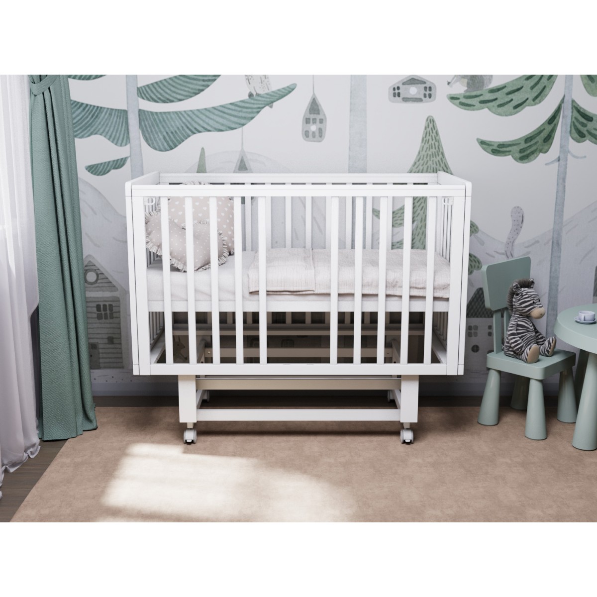 -Кроватка идет на маятниковом механизме с колесами