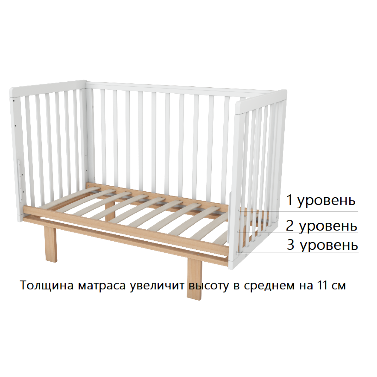 -Три уровня высоты спального ложа для регулировки в соответствии с ростом ребенка или высотой родительской кровати.