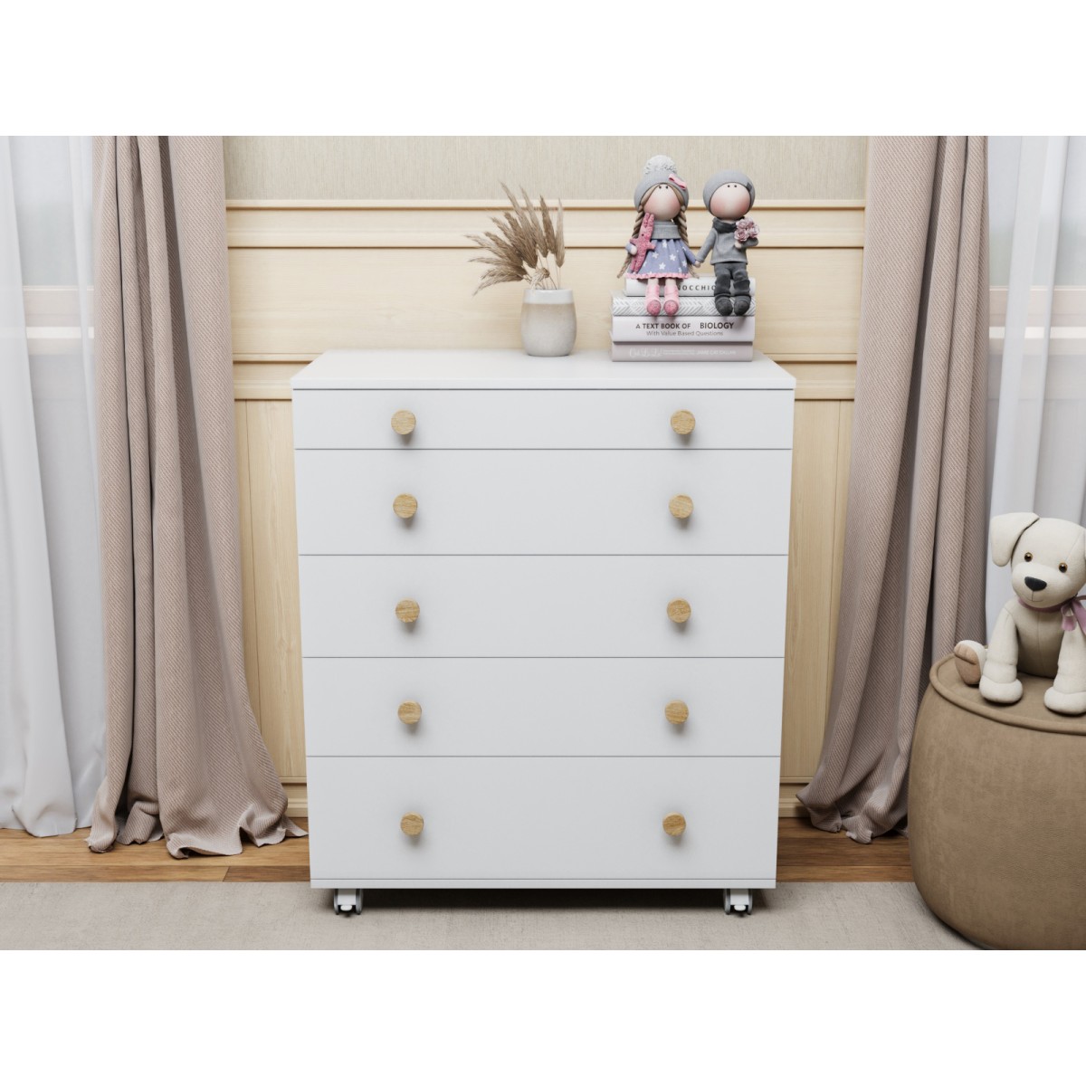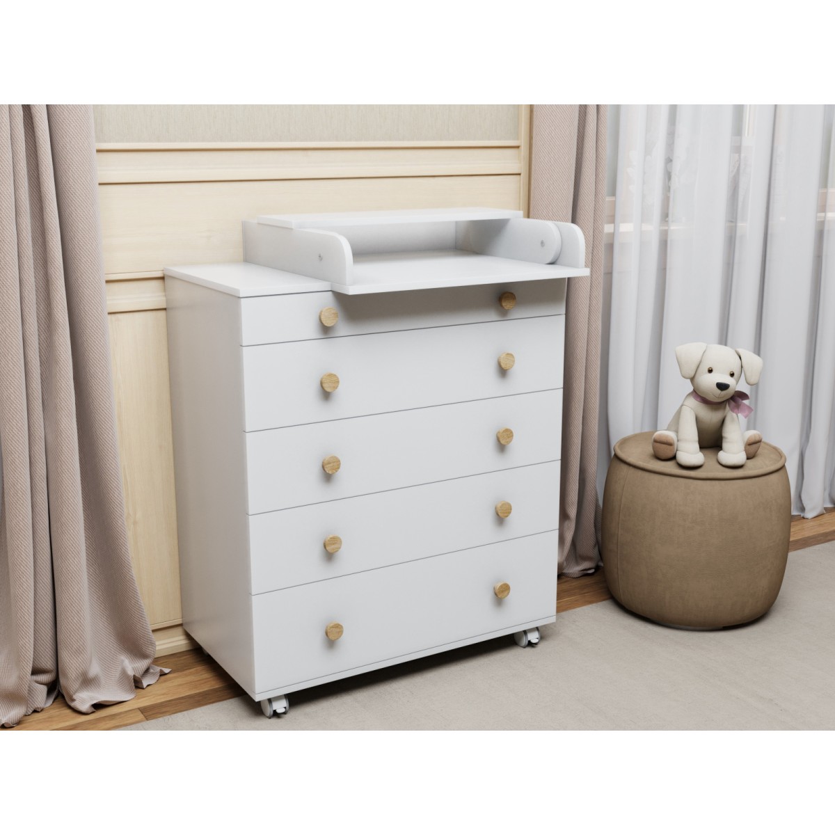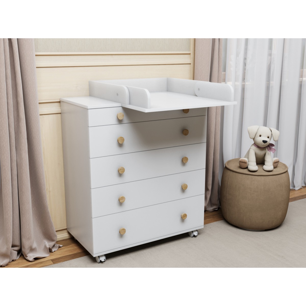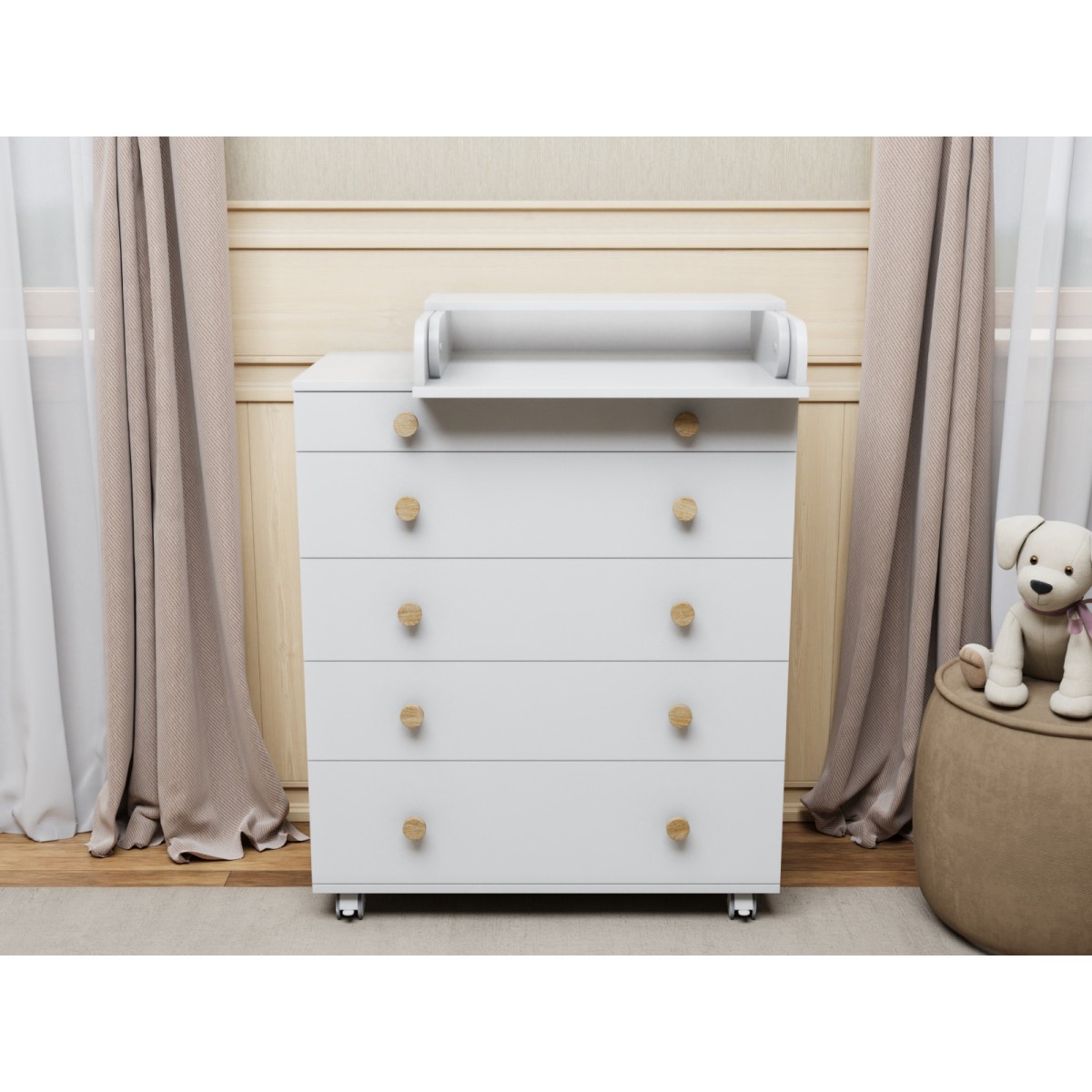 Комод пеленальный Lunna Teddy с колесами на 5 ящиков + пеленальная зона цвет: белый