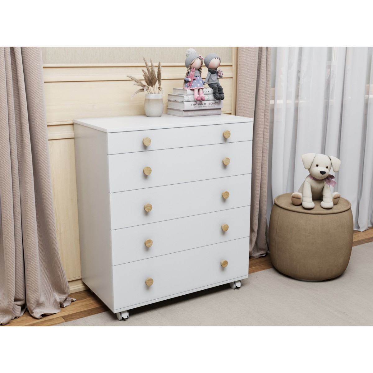 Комод укомплектован 2-мя вариантами ручек: круглые и в виде Teddy.