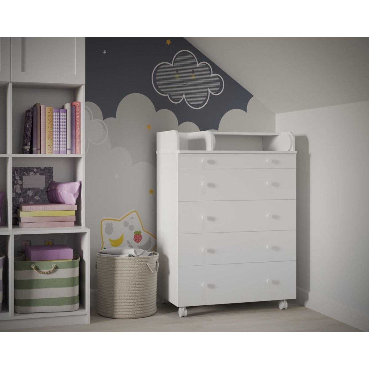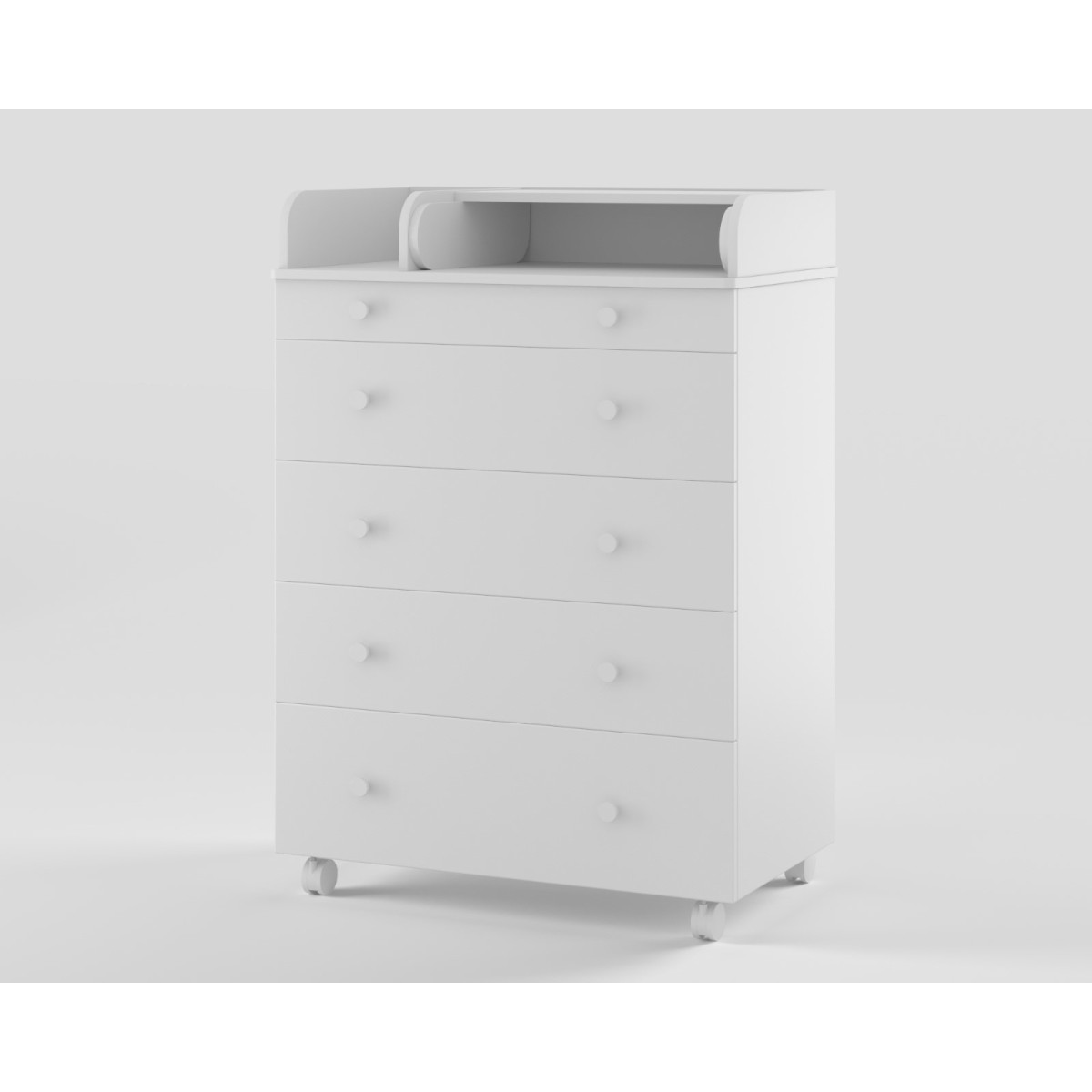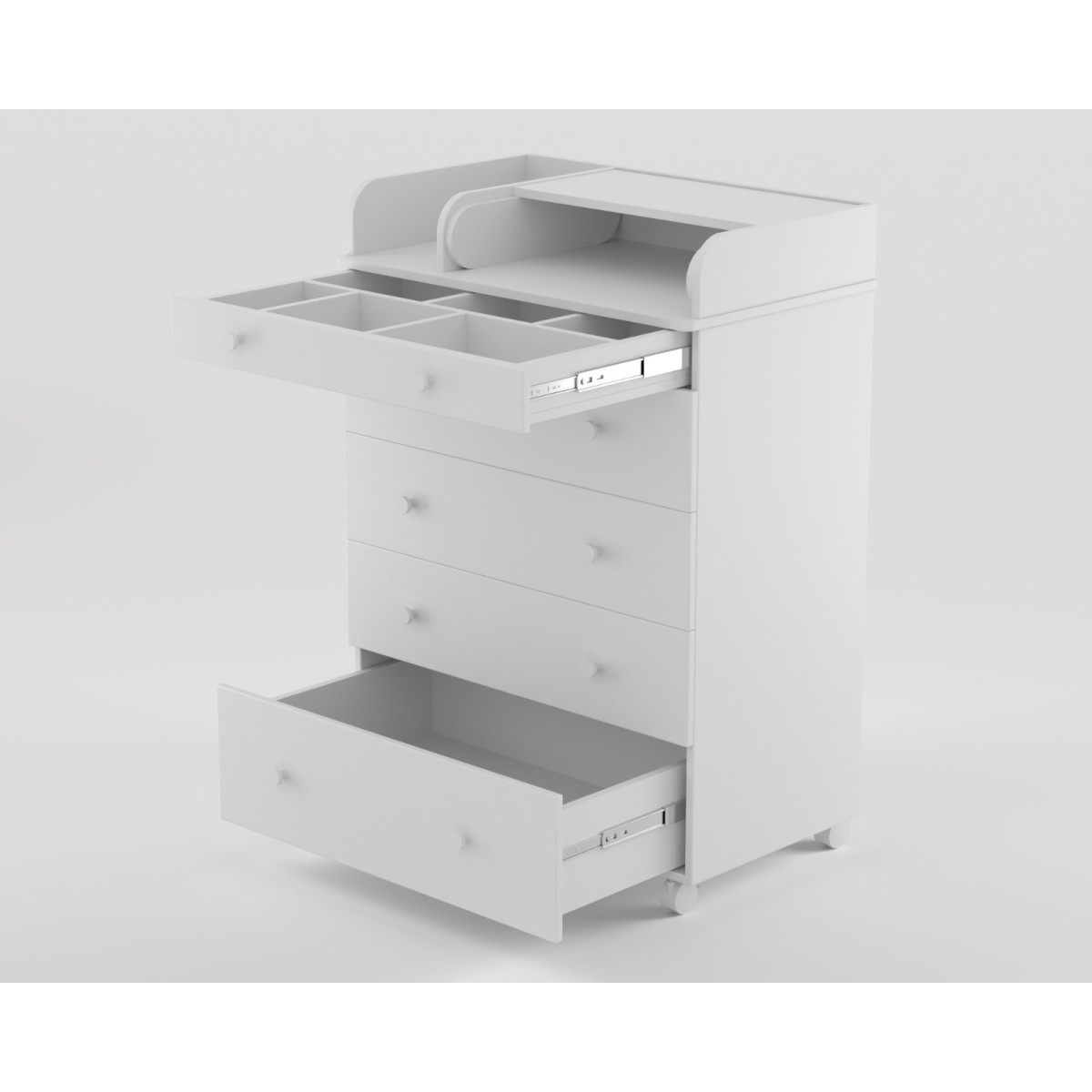 На комоде расположен складной пеленальный столик, который в сложенном виде может использоваться как дополнительные полочки. Рядом с пеленальным столиком есть удобное место для аптечки и гигиенических средств ребенка. В разложенном виде пеленальный столик очень удобен, имеет высокие бортики безопасности. Пеленальный столик позволит маме осуществлять все необходимые гигиенические процедуры для ребенка, переодевание, пеленание, на удобной для нее высоте.