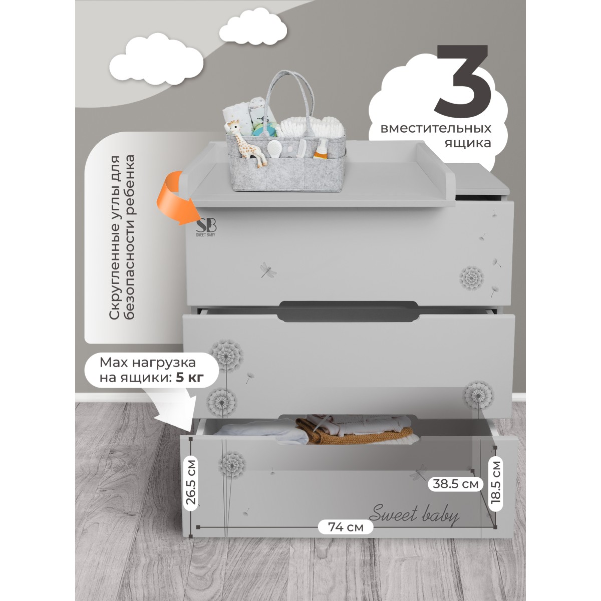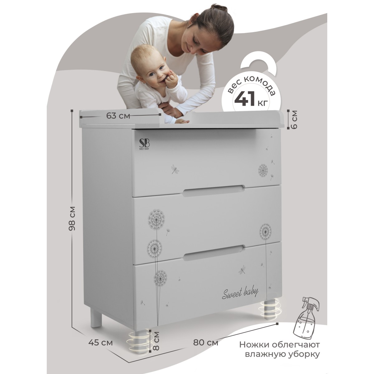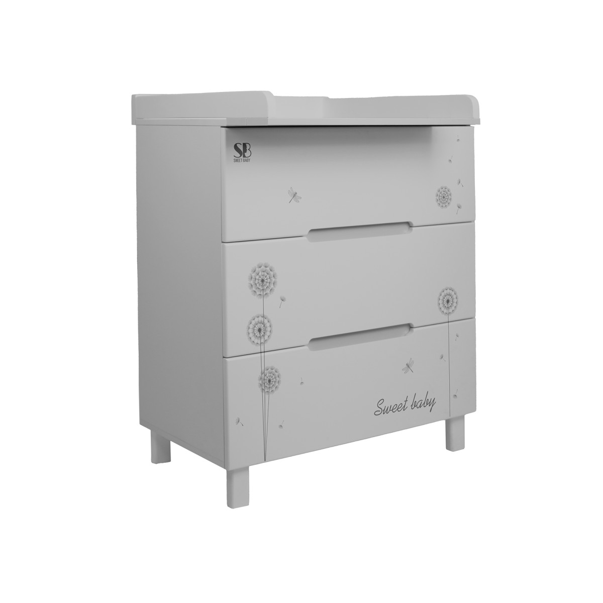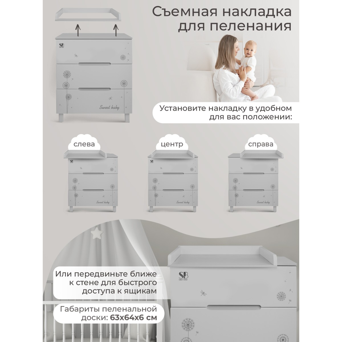 У комода есть съемный пеленальный столик, который делает процесс пеленания удобным и безопасным как для вас, так и для вашего новорожденного ребенка.