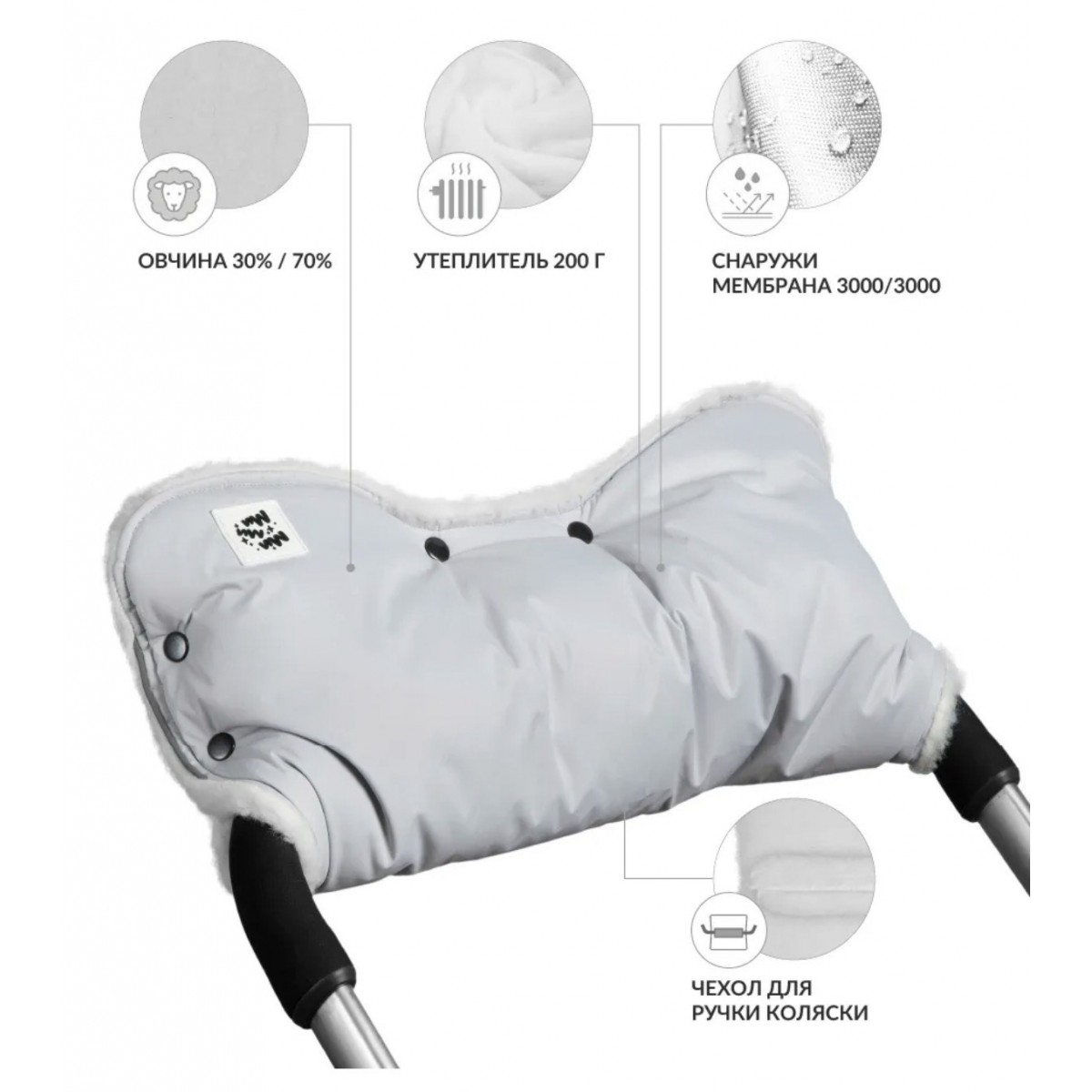 Универсальная муфта для рук на коляску и сани. Она защитит руки от замерзания, обветривания во время прогулок поздней осенью, зимой и весной. Крепление на кнопках позволяет быстро снимать и надевать муфту на коляску или санки со сплошной ручкой. Овчина, синтетический утеплитель и непромокаемая мембрана обеспечивают комфорт в любую погоду при температуре от +10 до -20 C. Муфта – аксессуар для колясок и детских саней, который повысит комфортность прогулок в холодную, сырую, ветреную или дождливую погоду. Она сохранит руки родителей в тепле, при этом освободит от ношения перчаток, варежек и рукавиц, которые нужно снимать, например, при посещении магазина. Кроме прямого назначения муфта может использоваться как утеплитель в коляску, на скамейку, сиденье авто. Также ее можно накинуть на ноги, если у ребенка чистая обувь. Внутри чехла на ручку коляски – натуральная овечья шерсти. Во время производства муфты она не подвергалась воздействию агрессивных химических веществ и красителей, поэтому сохранила антибактериальные свойства. Второй слой муфты для детской коляски выполнен из синтетического уплотнителя плотностью 200 г/кв. м. Они позволяют коже «дышать» при положительной температуре, поэтому руки не потеют, и хорошо сохраняет тепло в морозную погоду. Плотное облегание исключает попадание холодного воздуха внутрь. Снаружи зимняя муфта с мехом покрыта плотной мембраной. Эта пароотводящая ткань обеспечивает защиту от промокания благодаря микроскопическим порам, которые меньше капли воды в тысячи раз.