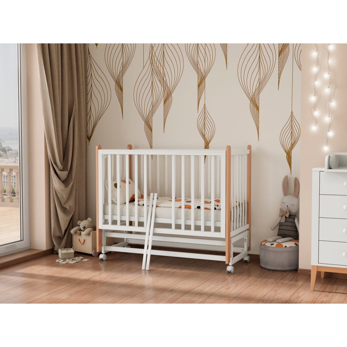 Кроватка детская Lunna Lika с маятником и колесами + быстросъемная стенка цвет: белый/ стойки бук