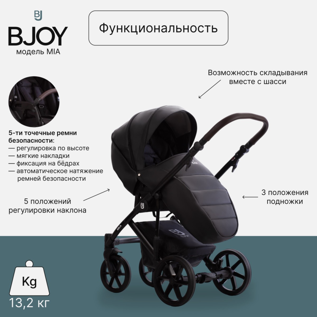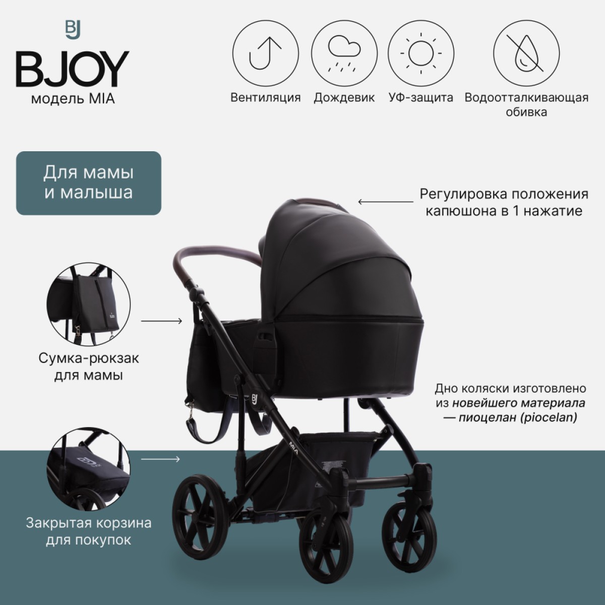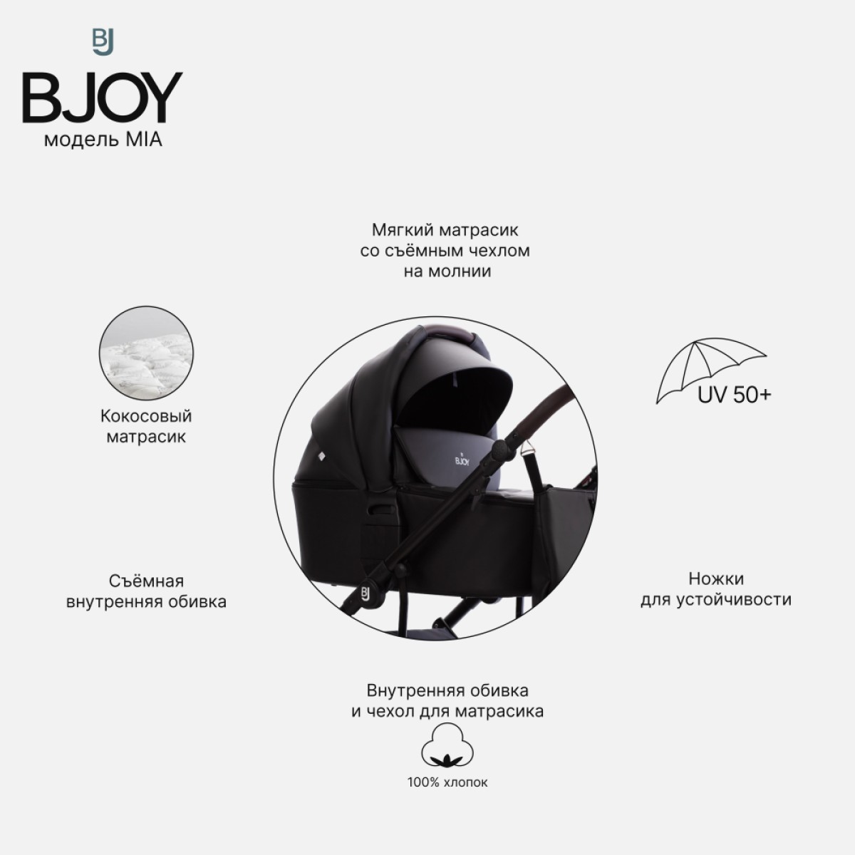 BJOY MIA – это еще и прогулочная коляска, предназначенная для растущего ребенка. Сиденье оснащено регулируемым капюшоном, что позволяет адаптировать его к текущим погодным условиям. Спинка и подножка регулируются, что позволяет принять удобное положение. Ремни «растут» вместе с ребенком, обеспечивая безопасность во время прогулок.