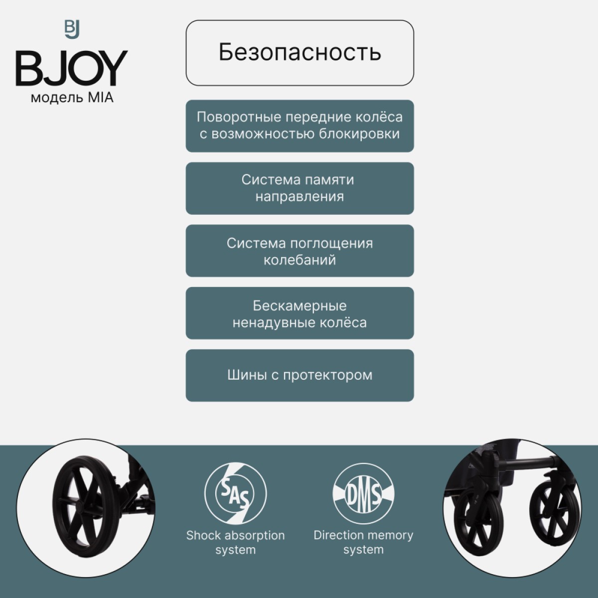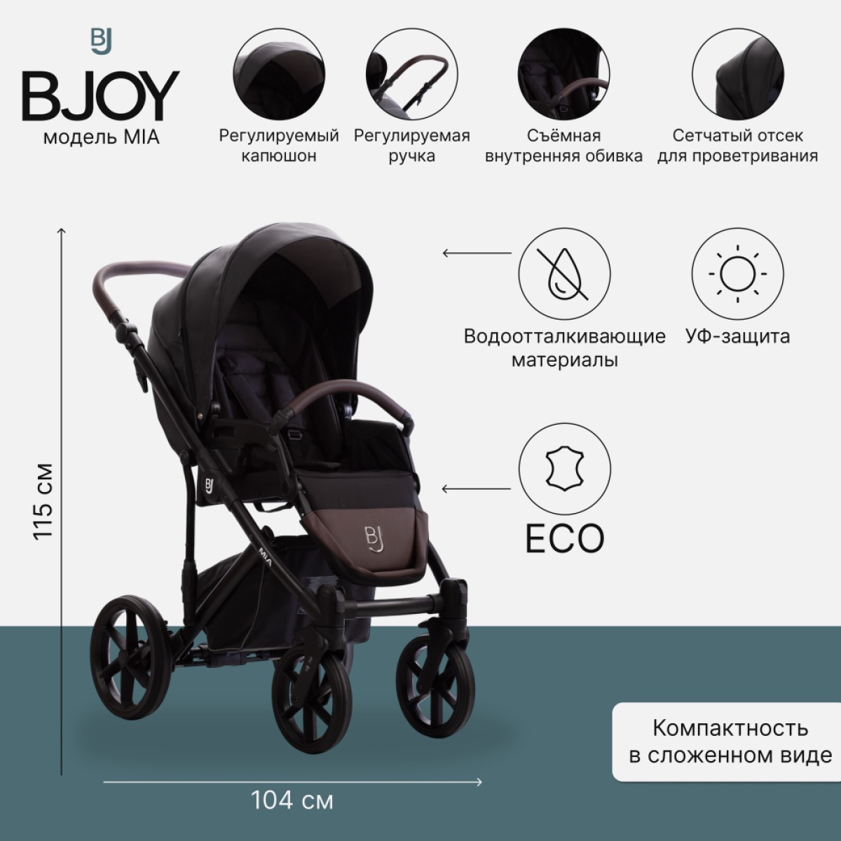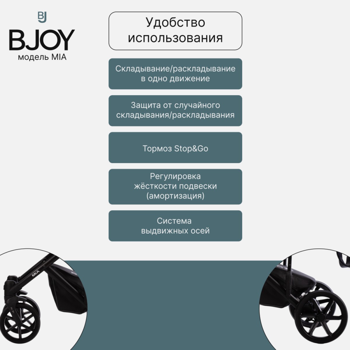 BJOY MIA – это еще и прогулочная коляска, предназначенная для растущего ребенка. Сиденье оснащено регулируемым капюшоном, что позволяет адаптировать его к текущим погодным условиям. Спинка и подножка регулируются, что позволяет принять удобное положение. Ремни «растут» вместе с ребенком, обеспечивая безопасность во время прогулок.