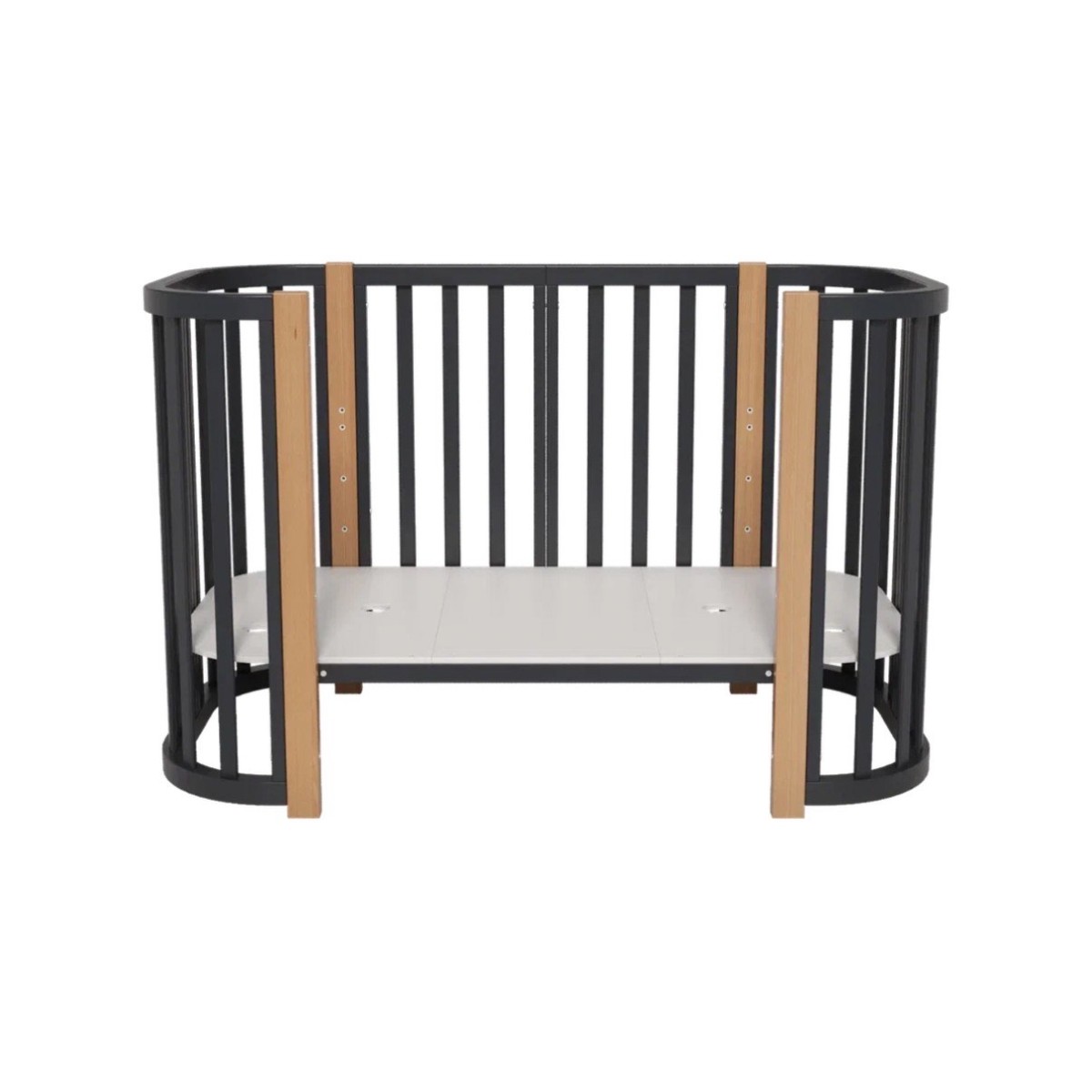 Далее кроватка трансформируется в овальную со спальным местом 120*60 см. Модель имеет современную овальную форму. Овальная форма кроватки предназначена для детей от года до четырех лет.