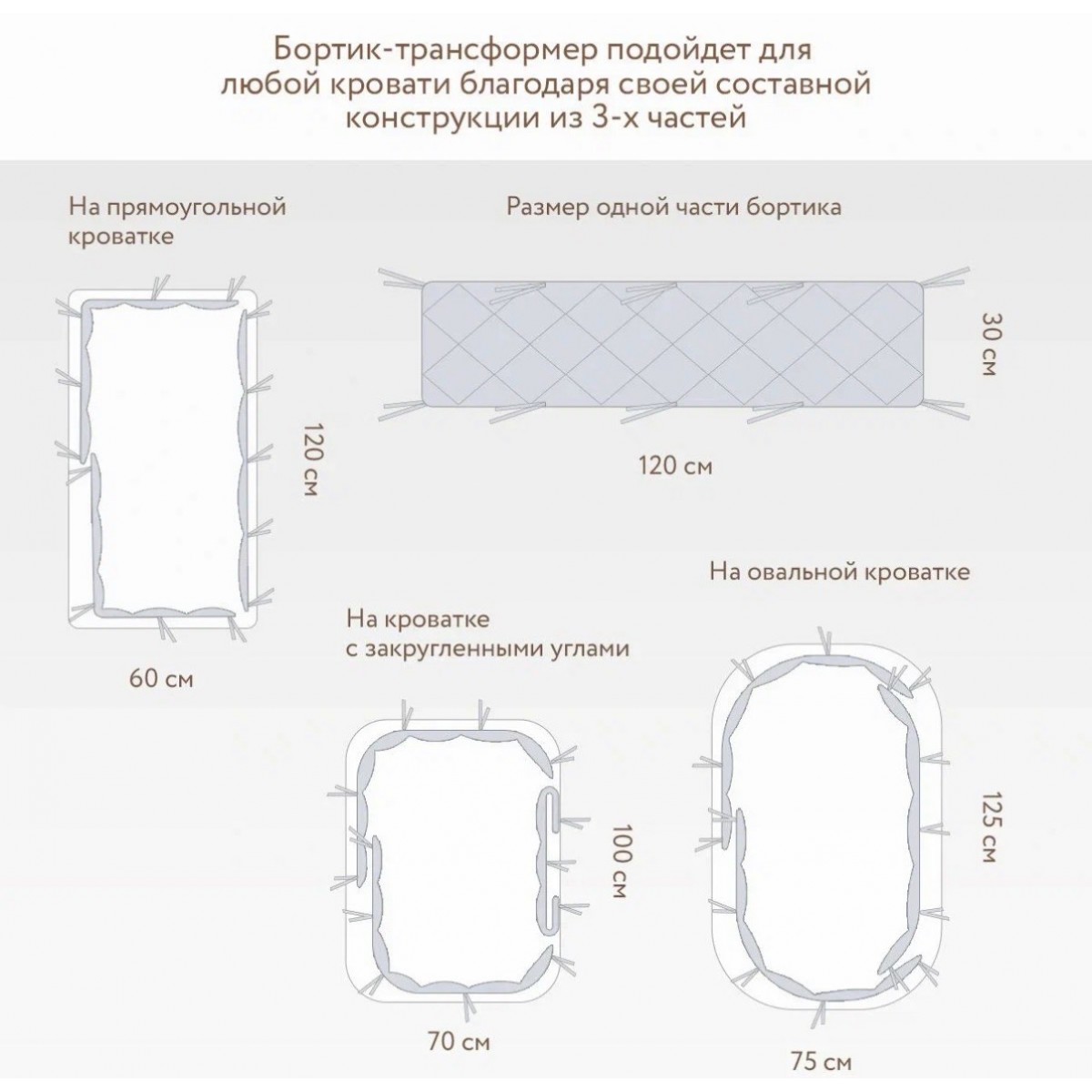 Бортики состоят из трёх одинаковых частей по 120 см, благодаря чему подходят для овальных, круглых и прямоугольных кроваток разных размеров.