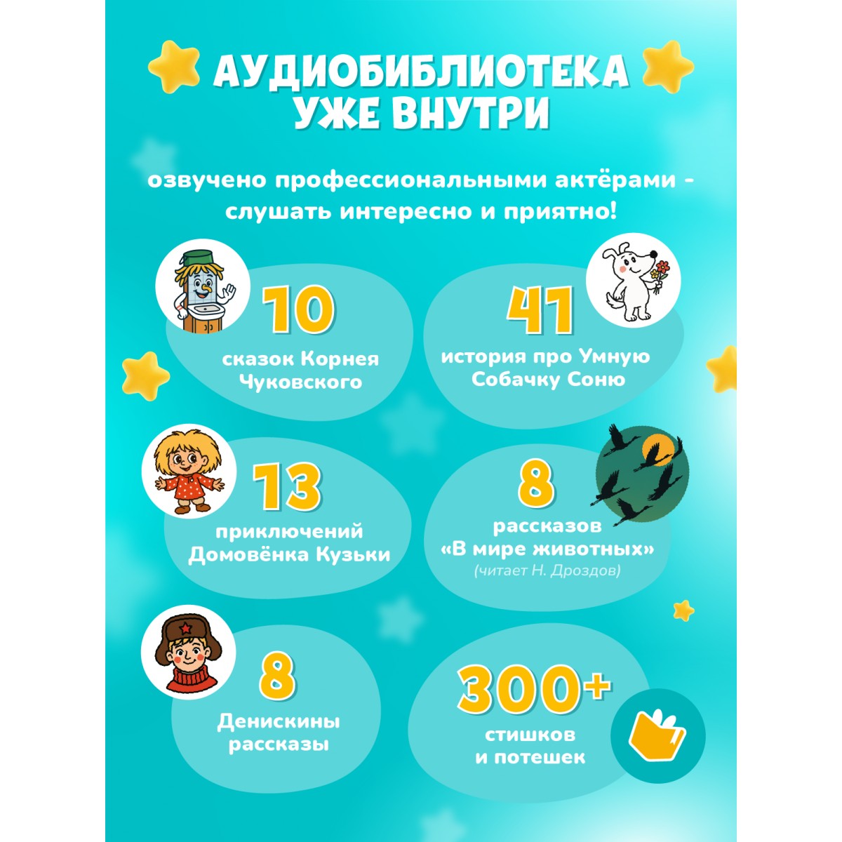Сказочно богатый контент. 10 сказок Корнея Чуковского, 41 история про Умную Собачку Соню, 13 приключений Домовёнка Кузьки, 8 рассказов «В мире животных» (читает Н. Дроздов), 8 рассказов из серии «Денискины рассказы», 276 весёлых стишков, а также колыбельные и 99 народных потешек.