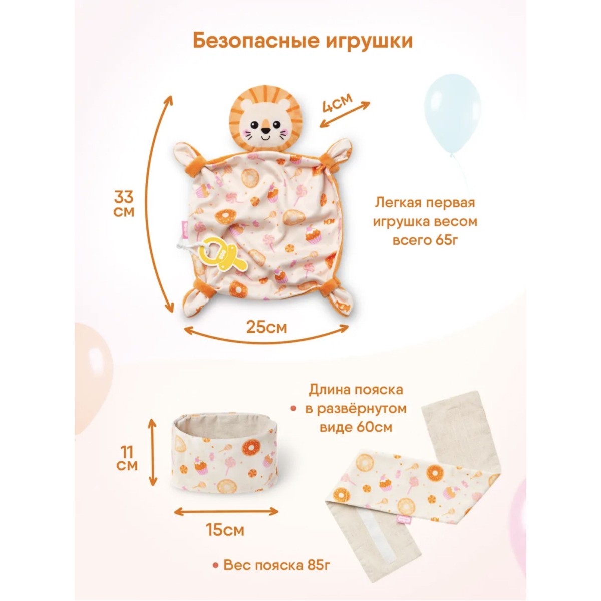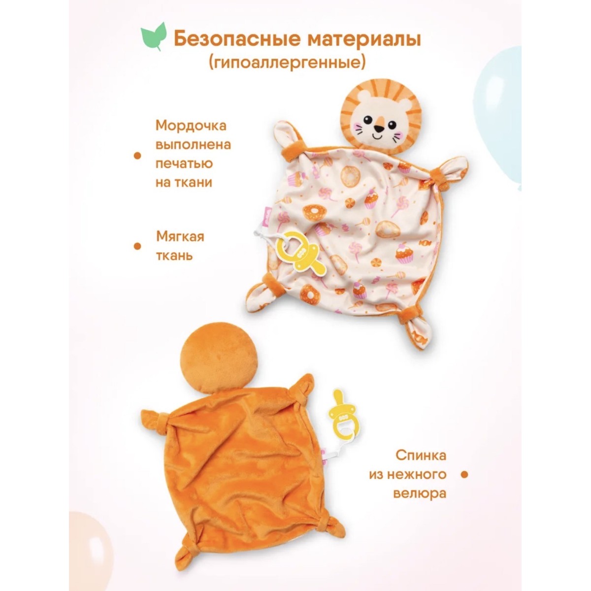 Мягчайшие материалы не раздражают кожу новорожденного. Прочная, качественная и безопасная фурнитура комфортера поможет закреплять соску и не терять ее, что облегчит жизнь ребеночка и родителей. Взаимодействуя с мягким комфортером, ребенок осваивает важнейшие навыки самоуспокоения и учится засыпать самостоятельно. А во время бодрствования комфортер отлично подойдет для активных игр – его приятная фактура ткани и вышивки поможет в развитии тактильного интеллекта и мелкой моторики. Разные ткани развивают тактильное восприятие. Использовать плюшевую зверушку для новорожденных легко — ее следует носить ближе к телу и прикладывать во время кормления и укачивания. Также можно класть в кроватку, коляску или автокресло. Мягкая ткань впитает родной запах мамы, и младенец всегда будет ощущать ее присутствие. Для дополнительного способа успокоения поможет соска, закрепленная с помощью держателя. Знакомая и любимая с первых дней жизни игрушка позволит малышу успокоиться в незнакомых ситуациях — на приеме у врача, в гостях или в магазине.